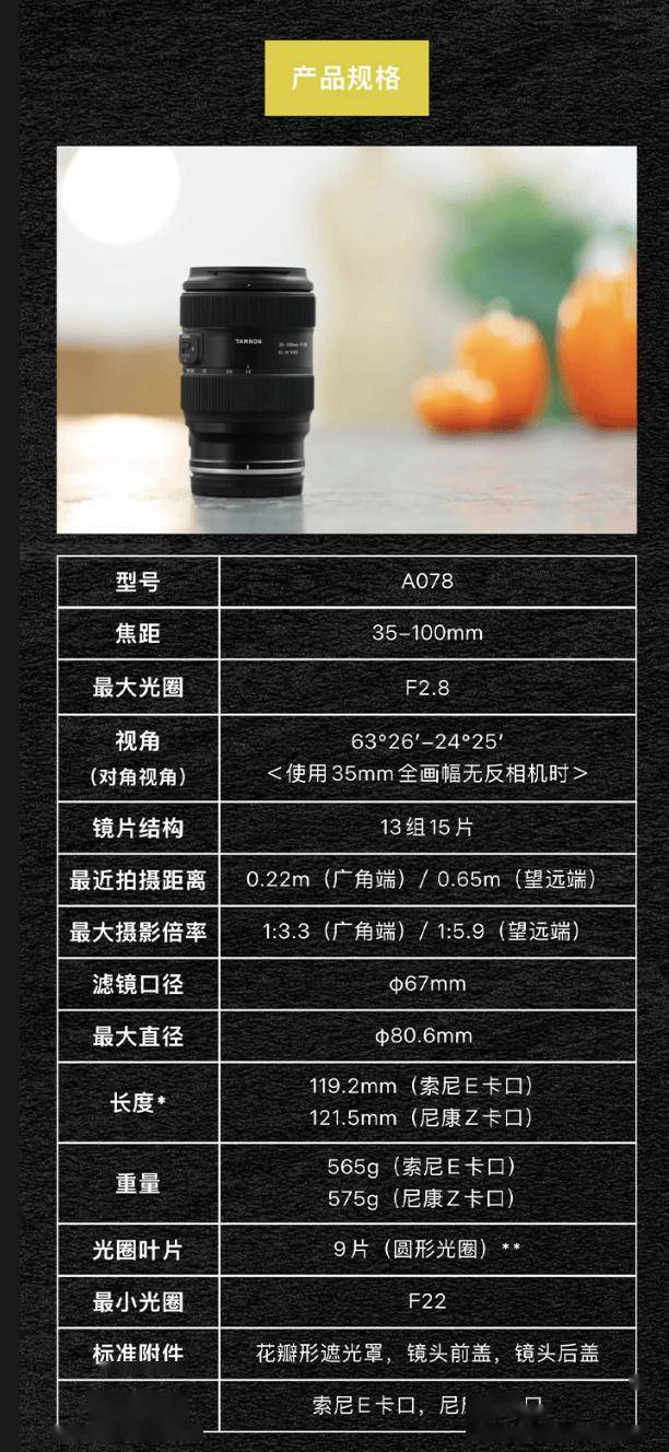 腾龙 35-100mm F/2.8 Di III VXD 大光圈全画幅变焦镜头 20 周年纪念版今日上市,型号为 A078Z,官方定价 6380 元,提供索尼 E 卡口、尼康 Z 卡口可选。 这款新品定位中高端,主打大光圈大变焦设计,相比常见的“大三元”24-70mm 镜头长焦端焦距更长。 据介绍,这款镜头相比 2021 年发售的 35-150mm F/2-2.8(A058)镜头更加轻便、紧凑,长 119.2mm,重 565g,搭载线性马达对焦机构 VXD,能够精准捕捉被摄体,广角端最近对焦距可达 0.22m。 规格方面,这款镜头采用 13 组 15 片光学结构,带有 9 片圆形光圈叶片,最小光圈 F22,适配索尼 FE、尼康 Z 卡口,滤镜口径 67mm,与腾龙大多数全画幅无反镜头产品保持统一,支持 TAMRON Lens Utility 软件,可后期升级固件等。 IT之家附该镜头详细参数如下: