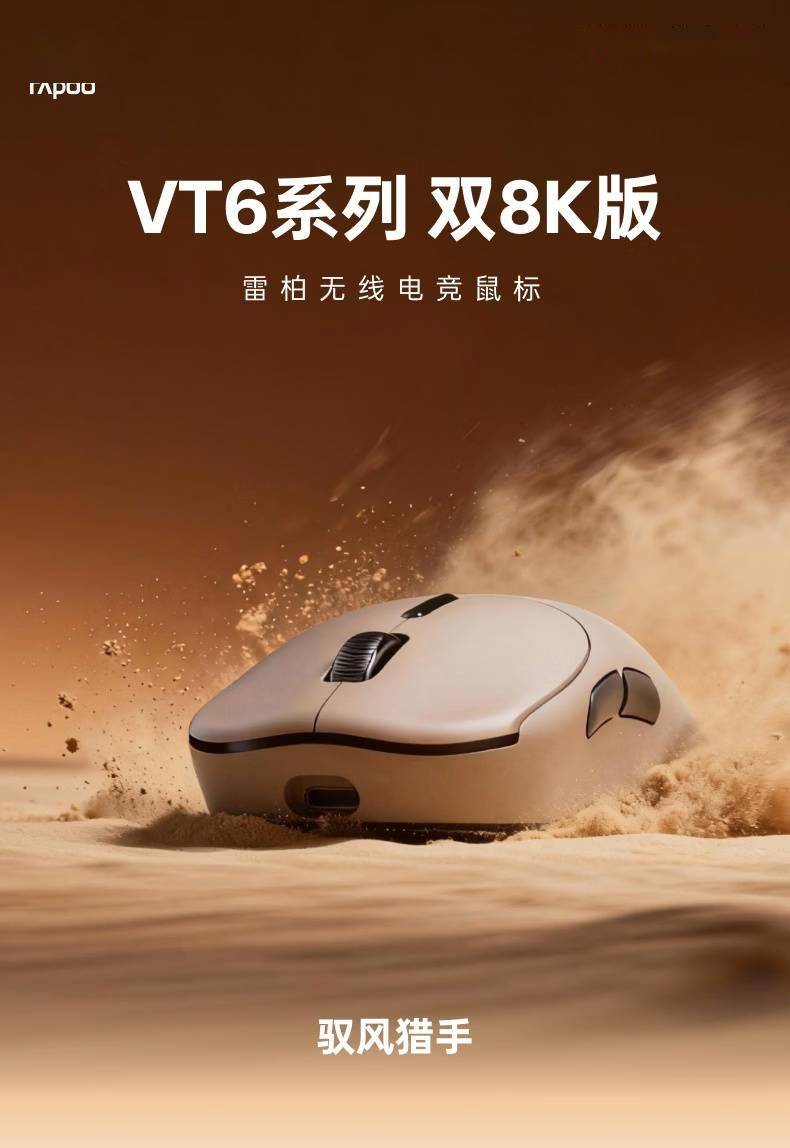 IT之家 3 月 24 日消息,雷柏新上架了一款 VT6 系列双 8K 版游戏鼠标,重约 55g,其中雷柏 VT6 二代双 8K 版为 199 元,雷柏 VT6 MAX 二代双 8K 版 299 元,均提供黑白棕色可选。 IT之家从商品页面获悉,该系列鼠标采用了 Nordic 54L15 芯片、凯华定制编码器、1.2 亿次定制光微动或 1 亿次欧姆龙机械微动,支持双 8K 回报率,最快按键扫描率 8KHz,全面适配主流游戏环境,支持 6 种性能模式,可实现超 20000FPS 的疾速静态扫描,按键抬起 / 按下消抖 0-32ms,无线最快按键速度≤0.225ms;配备 800mAh 锂电池,1000Hz 可连续使用 750 小时。