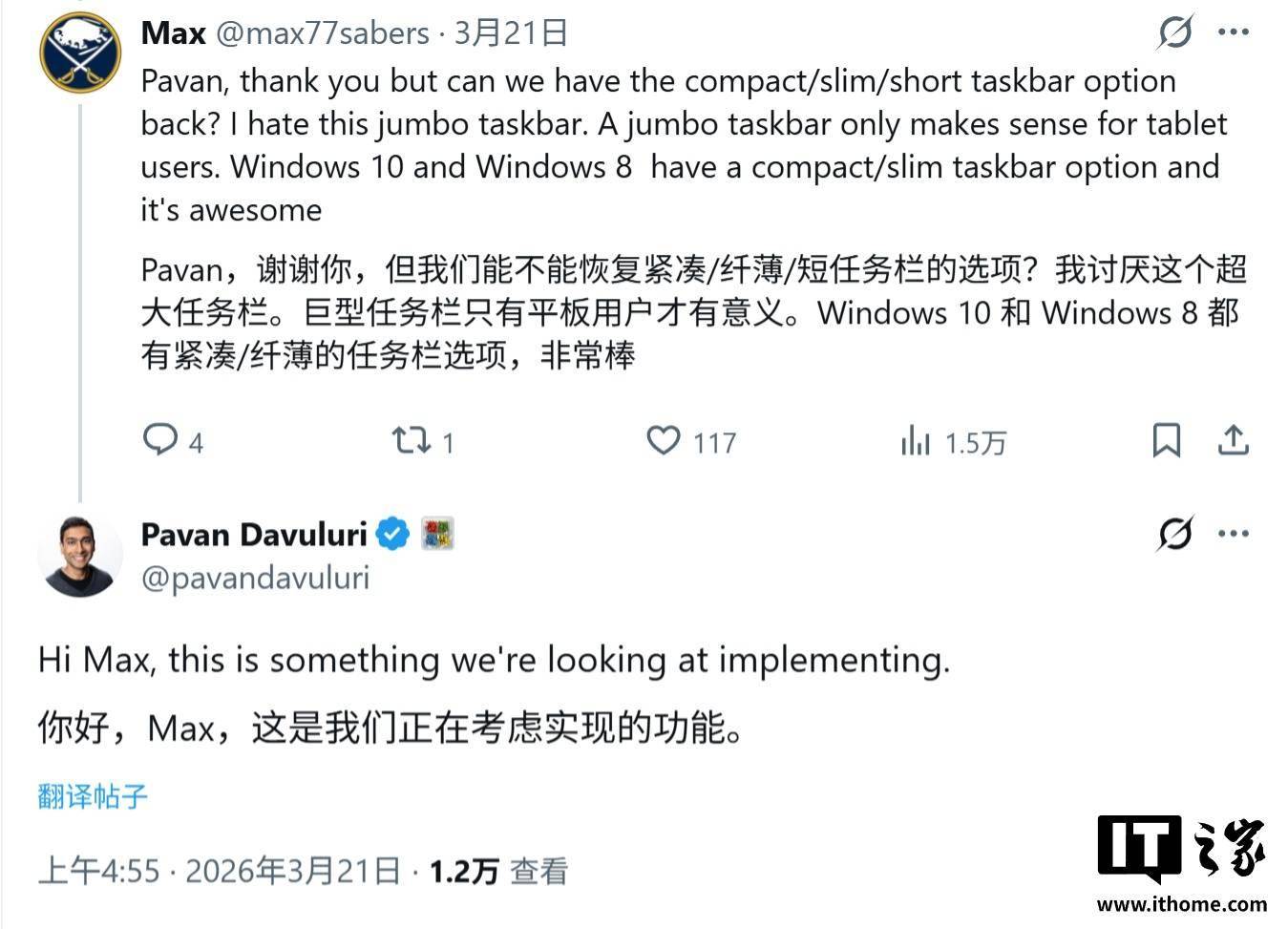 科技媒体 Windows Latest 今天(3 月 26 日)发布博文,报道称微软确认将升级 Windows 11 任务栏,引入类似 Windows 10 的“紧凑型任务栏”设计,让用户调整任务栏尺寸。 IT之家援引博文介绍,在目前的 Windows 11 版本中,任务栏尺寸是锁定的,这困扰许多 14 英寸笔记本用户,尤其是在低分辨率屏幕上,固定的任务栏显得异常巨大,挤占了办公空间。 Windows 10 系统内置紧凑型任务栏 在 Windows 11 现有设置中,虽然有一个“显示较小任务栏按钮”的选项,但用户启用后仅能缩小图标,任务栏本身的高度并不会改变,这被不少用户戏称为“伪功能”。 Windows 11 开启“显示较小任务栏按钮”效果 用户只能通过修改注册表或使用第三方工具来调整,但微软 Windows 负责人 Pavan Davuluri 在社交平台表示为降低用户对“巨型任务栏”的不满,官方正在着手实现这一功能。 微软此前还确认将恢复任务栏的移动功能,用户可以将任务栏拖动到屏幕顶部或左右两侧,彻底打破 Windows 11 发布以来任务栏只能“常驻底部”的限制。