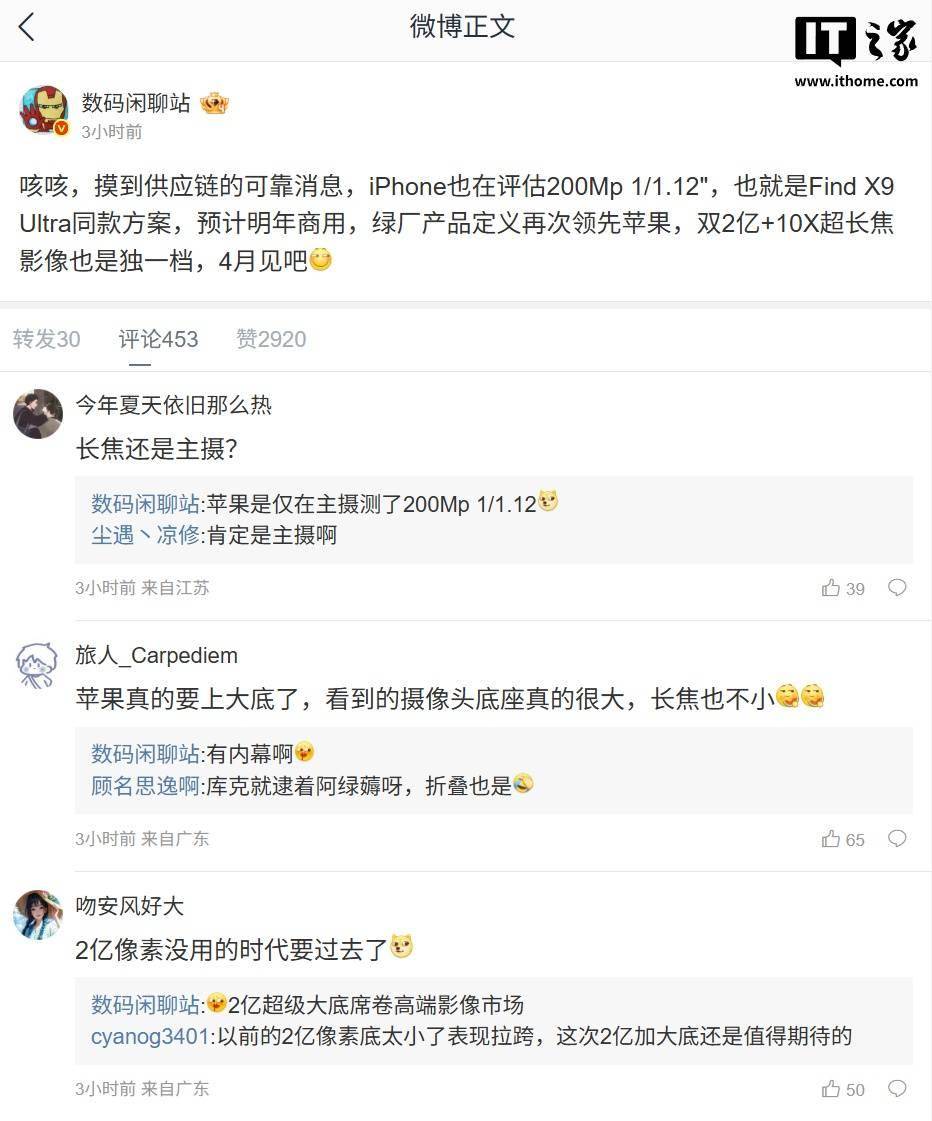 数码闲聊站 今日爆料了苹果 iPhone 后续新机的部分规格: 咳咳,摸到供应链的可靠消息,iPhone 也在评估 200Mp 1/1.12",也就是 Find X9 Ultra 同款方案,预计明年商用,绿厂产品定义再次领先苹果,双 2 亿 +10X 超长焦影像也是独一档,4 月见吧
