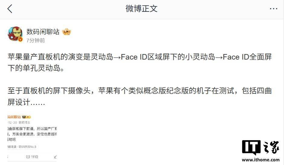 从爆料来看,明年的 iPhone(网传的 iPhone 19 系列或者 iPhone 20 系列,恰逢 iPhone 手机问世 20 年)有望用上 200Mp 1/1.12" 图像传感器,博主还称“苹果是仅在主摄测了 200Mp 1/1.12”。 该博主今日还透露: 苹果量产直板机的演变是灵动岛 → Face ID 区域屏下的小灵动岛 → Face ID 全面屏下的单孔灵动岛。 至于直板机的屏下摄像头,苹果有个类似概念版纪念版的机子在测试,包括四曲屏设计……