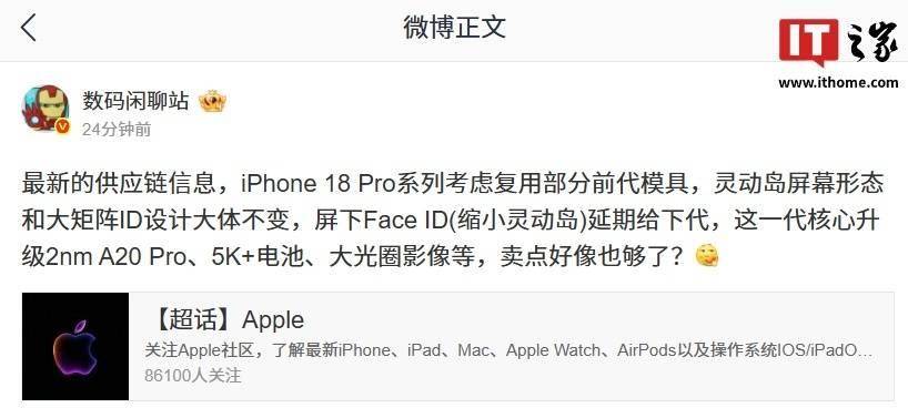 该博主还曾在 3 月 11 日透露,最新的供应链信息显示,iPhone 18 Pro 系列考虑复用部分前代模具,灵动岛屏幕形态和大矩阵 ID 设计大体不变,屏下 Face ID(缩小灵动岛)延期给下代。 博主表示,苹果 iPhone 18 Pro 系列的核心升级点包括 2nm 制程工艺的 A20 Pro 芯片、5000mAh 级别电池,以及大光圈影像等。 IT之家综合此前消息来看,苹果今年 9 月只会推出 iPhone 18 Pro 系列和首款阔折叠 iPhone Fold,且基本都是万元机档位。苹果最终的目标,是打造一款正面是一整块玻璃、无任何开孔的 iPhone。 这一设计有望在 2027 年为庆祝 iPhone 推出 20 周年时实现,但 2026 年秋季发布的 iPhone 18 Pro 系列并不会做到这一点。另外,iPhone 18 Pro 还有望升级 2400 万像素前置摄像头。
