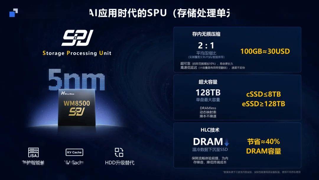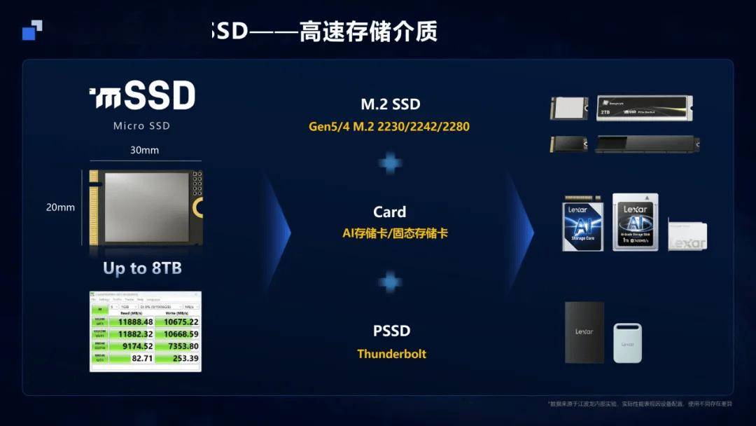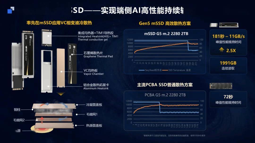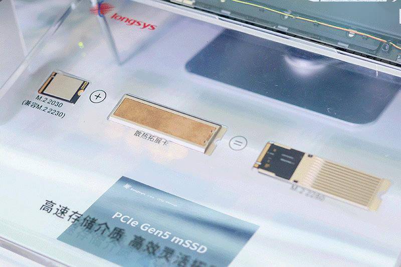 IT之家 3 月 30 日消息,江波龙 Longsys 在上周举行的 CFMS | MemoryS 2026 上宣布将其采用集成封装的 mSSD (Micro SSD) 产品线扩展至 PCIe Gen5,相较原有的 Gen4 解决方案实现显著性能提升。 Gen5 mSSD 采用联芸 MAP1802 主控芯片,延续 DRAM-less 设计,尺寸小至 20mm × 30mm,兼容 M.2 2230,可扩展衍生为 M.2 2242 / 2280、AI / 固态存储卡、pSSD(IT之家注:移动固态硬盘)等多种外形规格。其顺序读写至高可达 11GB/s 和 10GB/s,随机读写至高可达 2200K IOPS 和 1800K IOPS,支持单盘 8TB 大容量。 针对 Gen5 mSSD 高热密度的属性,江波龙为其提供了集成均热板的散热解决方案。这一热管理硬件系统包含均热器 +TIM1 导热胶、石墨烯散热片、均热板、铝合金散热拓展卡,可实现 181s 持续峰值顺序读取,连续读取容量可达 1991GB,是常规 PCBA SSD 散热方案的近 2.5 倍。 江波龙此次还推出了 SPU 和与其配套的 iSA 存储智能体。其中前者是面向智能存储架构打造的专用处理单元,这款代号 WM8500 的芯片采用 5nm 先进制程工艺,可以 DRAM-less 实现 128TB 大容量,此外其支持 HLC 高级缓存和存内无损压缩技术,拥有 2:1 的平均压缩比。 而 iSA 存储智能体是面向端侧 AI 推理的智能调度引擎,可高效解决端侧 AI 推理的存储调度难题。在锐龙 AI Max+ 395 硬件平台上,江波龙与 AMD 合作实现 397B 超大模型本地部署,在 256K 超长上下文(122B)场景下,将 DRAM 占用降低近 40%。