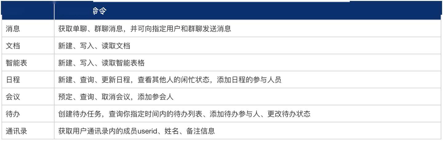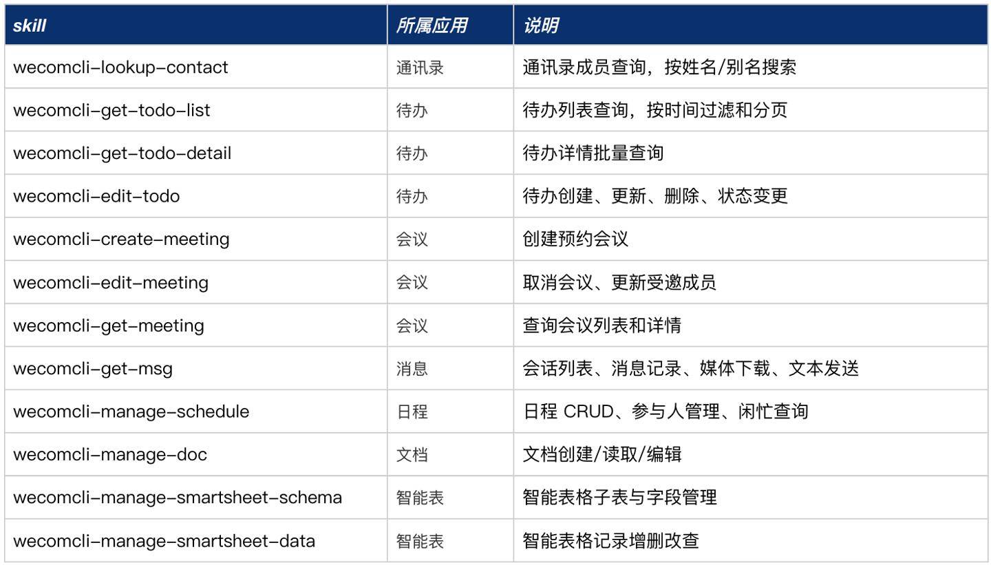 随后,用户可以安装 CLI 和 CLI SKILL。 npm install -g @wecom/clinpx skills add WeComTeam/wecom-cli -y -g安装后,用户可通过配置企业微信机器人凭证(交互式、仅需一次)及调用工具来快速开始。 wecom-cli initwecom-cli contact get_userlist '{}'其包含如下 Skills。 skill所属应用说明wecomcli-lookup-contact通讯录通讯录成员查询,按姓名 / 别名搜索wecomcli-get-todo-list待办待办列表查询,按时间过滤和分页wecomcli-get-todo-detail待办待办详情批量查询wecomcli-edit-todo待办待办创建、更新、删除、状态变更wecomcli-create-meeting会议创建预约会议wecomcli-edit-meeting会议取消会议、更新受邀成员wecomcli-get-meeting会议查询会议列表和详情wecomcli-get-msg消息会话列表、消息记录、媒体下载、文本发送wecomcli-manage-schedule日程日程 CRUD、参与人管理、闲忙查询wecomcli-manage-doc文档文档创建 / 读取 / 编辑 wecomcli-manage-smartsheet-schema智能表智能表格子表与字段管理 wecomcli-manage-smartsheet-data智能表智能表格记录增删改查 |
