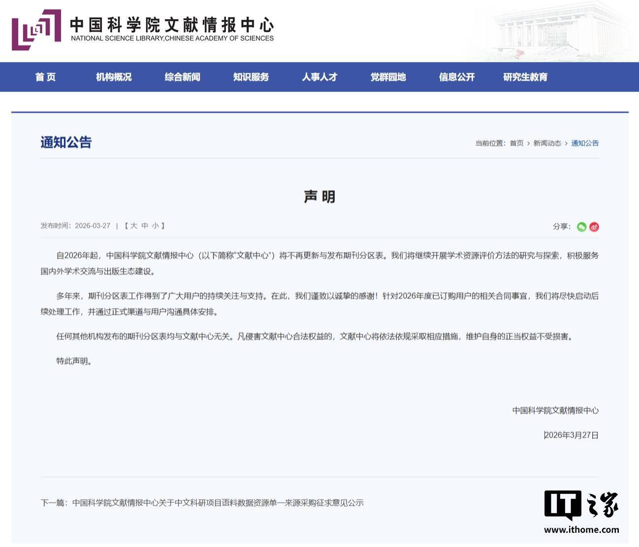 中国科学院文献情报中心在 3 月 27 日发表声明,宣布将不再更新与发布期刊分区表。这标志着运行二十余年、一度成为科研评价“硬标尺”的中国科学院期刊分区表,正式退出历史舞台。 IT之家附中国科学院文献情报中心声明原文如下: 自 2026 年起,中国科学院文献情报中心(以下简称“文献中心”)将不再更新与发布期刊分区表。我们将继续开展学术资源评价方法的研究与探索,积极服务国内外学术交流与出版生态建设。 多年来,期刊分区表工作得到了广大用户的持续关注与支持。在此,我们谨致以诚挚的感谢!针对 2026 年度已订购用户的相关合同事宜,我们将尽快启动后续处理工作,并通过正式渠道与用户沟通具体安排。 任何其他机构发布的期刊分区表均与文献中心无关。凡侵害文献中心合法权益的,文献中心将依法依规采取相应措施,维护自身的正当权益不受损害。 特此声明。 中国科学院文献情报中心 2026 年 3 月 27 日