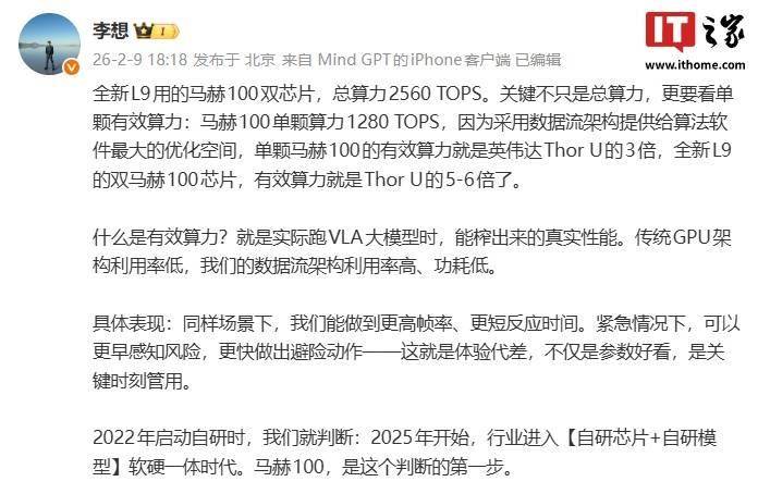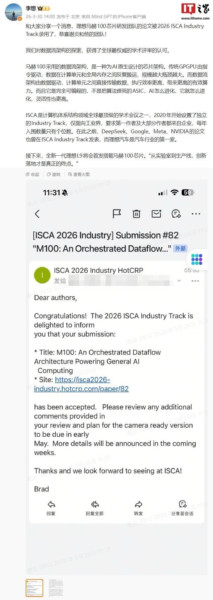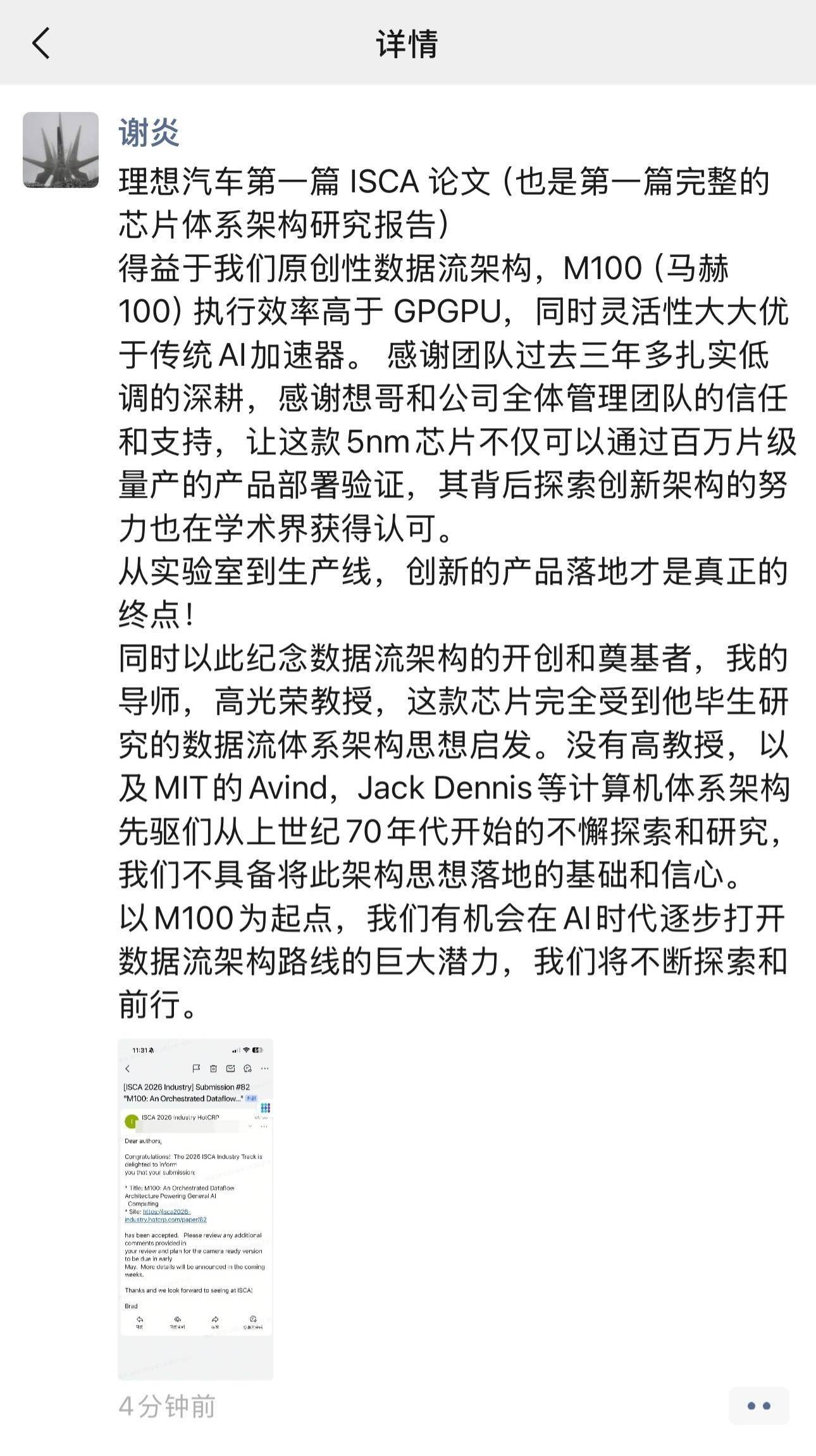 理想汽车 CEO 李想今日发文宣布,理想马赫 100 芯片研发团队的论文被 2026 ISCA Industry Track 录用。李想表示,理想对数据流架构的探索,获得了全球最权威的学术评审的认可。 据介绍,ISCA 是计算机体系结构领域全球最顶级的学术会议之一,2020 年开始设置独立的 Industry Track,仅面向工业界,要求第一作者及大部分作者都来自企业,每年入围数量仅个位数。 DeepSeek、Google、Meta、NVIDIA 的论文也曾在 ISCA Industry Track 发表,理想汽车是汽车行业的第一家。 李想表示,马赫 100 采用的数据流架构,是一种为 AI 原生设计的芯片架构。传统 GPGPU 由指令驱动,数据在计算单元和全局内存之间反复搬运,规模越大瓶颈越大。 而数据流架构由数据驱动,计算单元之间直接传输数据,执行效率更高,带来更高的有效算力。而且它是完全可编程的,不是把算法焊死的 ASIC,AI 怎么进化,它就怎么进化,灵活性也更高。 值得一提的是,全新一代理想 L9 汽车将会首发搭载马赫 100 芯片。 参考IT之家此前报道,李想在今年 2 月 9 日发文介绍了全新理想 L9 搭载的马赫 100 双芯片(总算力 2560 TOPS)。他表示,关键不只是总算力,更要看单颗有效算力。 马赫 100 单颗算力 1280 TOPS,因为采用数据流架构提供给算法软件最大的优化空间,单颗马赫 100 的有效算力就是英伟达 Thor U 的 3 倍,全新 L9 的双马赫 100 芯片,有效算力就是 Thor U 的 5-6 倍了。