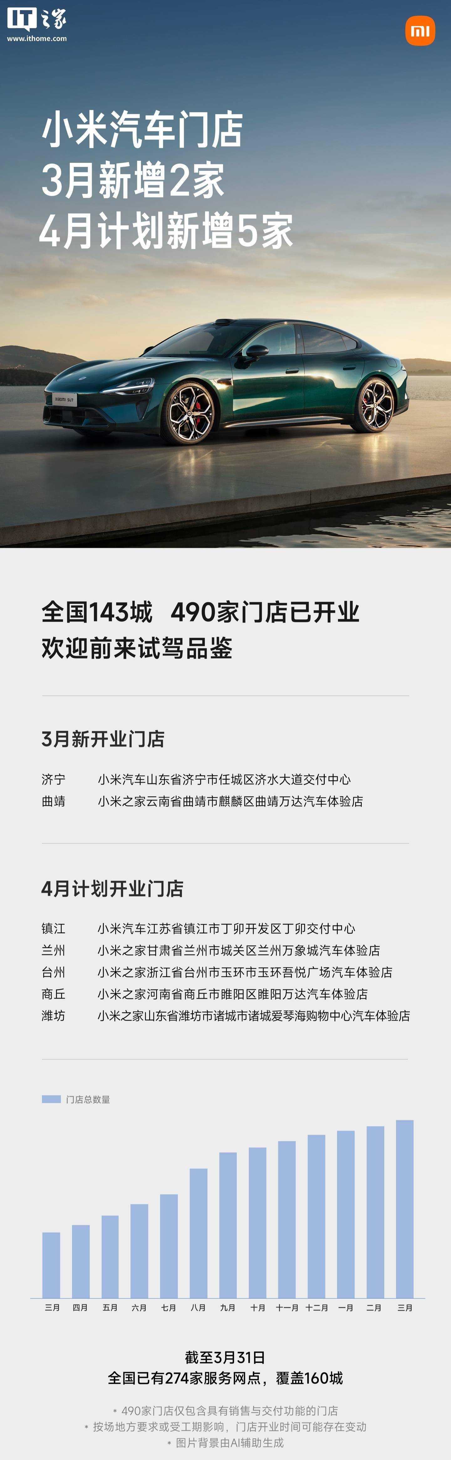 小米汽车官方今日公布了开店新进展: 3 月新增 2 家门店,4 月计划新增 5 家门店,已经基本覆盖全国省份 / 直辖市 / 自治区。截至 3 月 31 日,全国已有 274 家服务网点,覆盖 160 城。