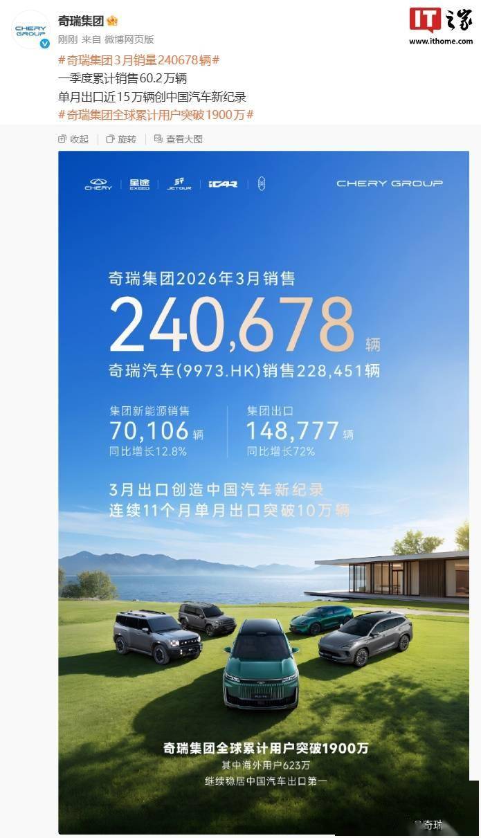 奇瑞集团官方刚刚宣布,3 月销量 240678 辆,一季度累计销售 60.2 万辆,单月出口近 15 万辆创中国汽车新纪录。 官方宣传海报显示,奇瑞集团新能源销售 70106 辆,同比增长 12.8%;集团出口 148777 辆,同比增长 72%;3 月出口创造中国汽车新纪录,连续 11 个月单月出口突破 10 万辆。 IT之家注意到,奇瑞集团全球累计用户还突破了 1900 万,其中海外用户 623 万,继续稳居中国汽车出口第一。