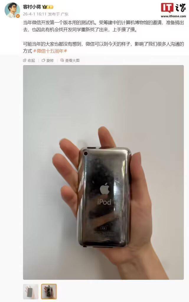 微信员工今日晒出了当年微信开发第一个版本用的测试机。从图片来看, 应该是苹果 iPod touch(第 4 代)。 微信员工 客村小蒋 透露, 受筹建中的计算机博物馆的邀请,准备捐出去,也因此有机会找开发同学重新找了出来,上手摸了摸。 IT之家注:苹果于 2010 年 9 月推出了 iPod touch(第 4 代)。其采用了 3.5 英寸 Retina 显示屏,搭载与 iPhone 4 相同的 A4 处理器,提供 8GB、16GB、32GB 和 64GB 容量可选。 iPod touch(第 4 代)还配备 iSight 摄像头和 FaceTime 高清摄像头,有白色和黑色两种配色。