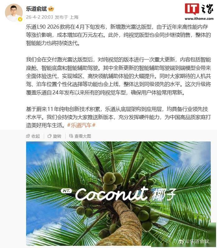 蔚来助理副总裁、乐道汽车产品负责人俞斌今日宣布,乐道 L90 2026 款将在 4 月下旬发布,新增激光雷达版型。 俞斌透露,由于近年来高性能内存等涨价影响,成本增加在万元左右。此外,纯视觉版型也会同步继续销售,整体的智能能力也将持续迭代。 另外,俞斌表示会在交付激光雷达版型后,对纯视觉的版本进行一次重大更新,内容包括智能座舱、智能底盘和智能辅助驾驶。其中全新更新的智能辅助驾驶端到端模型会带来全面体验迭代,实现城区、高快领航辅助体验的大幅提升。 同时,用户所期待的人机共驾、泊车位置个性化选择等功能也会上线,宣称“整体达到同级领先的水平”。 这次升级将覆盖乐道自 24 年发布以来所有的纯视觉车型。 据IT之家此前报道,乐道 L90 激光雷达版已现身工信部,该版本车型相对于现款主要就是加入了激光雷达,并提供双色车身 / 全新轮圈供用户选择。车辆尾灯采用横条设计,同时也支持智能交互功能,同步配备有车顶扰流板以及隐藏式后雨刷。 作为比较,目前在售的乐道 L90 全系采用纯视觉智驾方案,标配 7 颗 800 万像素高清摄像头、4 颗 300 万像素环视摄像头、1 颗 4D 成像毫米波雷达以及 12 颗超声波雷达,并搭载单颗英伟达 Orin-X 芯片(算力 254TOPS),能够实现高速 / 城市 NOA 等领航辅助功能。激光雷达的加入将进一步提升车辆在复杂路况下的感知能力和安全性。