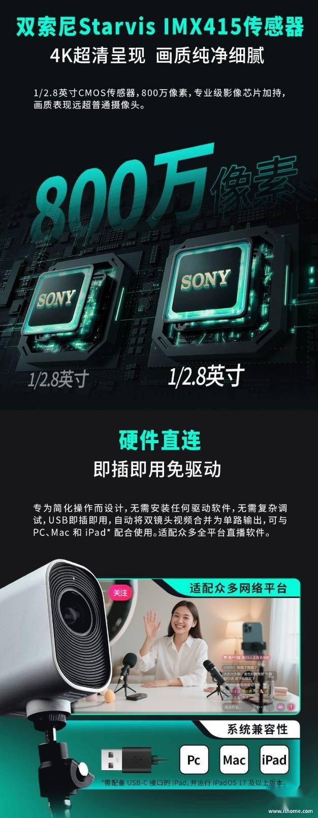 IT之家 4 月 2 日消息,创新现已在京东上架一款 PROJECT WATCHER 直播摄像头套件,其采用分体式设计,由两个摄像头构成,定价为 699 元,首发价低至 629 元。 该直播摄像头配备 1/2.8 英寸 8MP 索尼 Starview IMX415 传感器,支持录制 4K 视频。其中摄像头 1 等效 35mm 定焦,而摄像头 2 提供 42-94 度 FOV(等效 20-55mm 变焦),适合直播切机位使用。 其他方面,相应摄像头套件内置全向 MEMS 麦克风,提供了快速切换机位的红外遥控器,IT之家附产品参数: