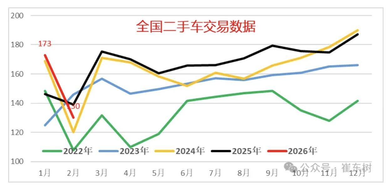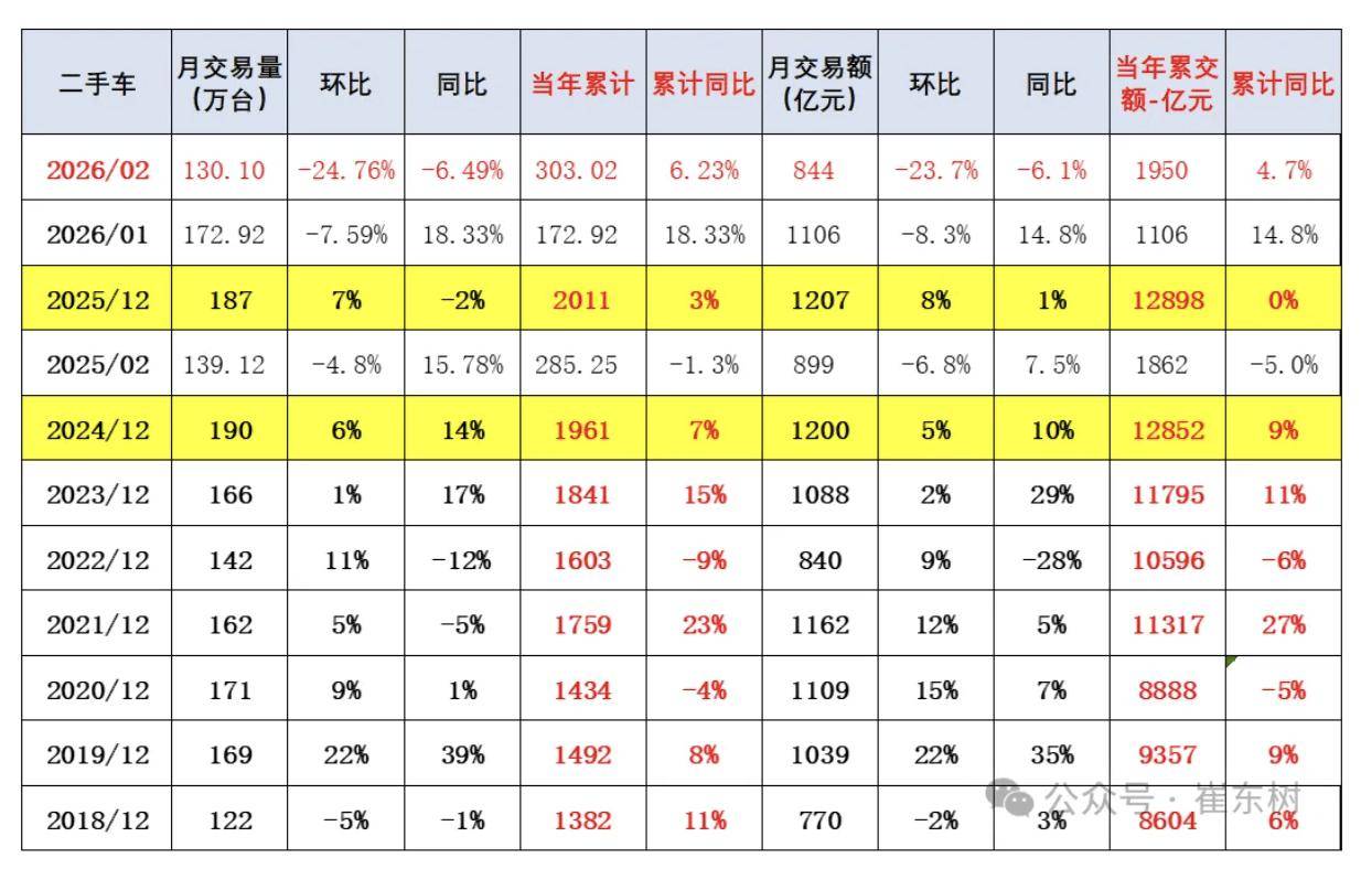 乘联分会崔东树昨天公布了 2026 年 2 月全国二手车市场行情,2 月全国二手车市场交易量 130.1 万台,环比降 25%,同比降 6.5%,交易金额为 884 亿元,同比降 6%。 具体来看,2026 年 1-2 月,二手车累计交易量 303 万台,同比增 6%,交易额 1950 亿元,增 4.7%。2026 年 2 月,全国新能源二手车市场交易量 10.7 万台,环比降 32%,同比增长 8%,新能源渗透率 11%。2026 年 1-2 月,新能源二手车累计交易量 26.5 万台,同比增 40%。 崔东树表示,在中国汽车流通协会的呼吁下,二手车流通改善。各地交管部门办实事,便利群众企业办事,促进二手车流通。但与国际市场相比,中国二手车的交易比例相对比较低,而中国的汽车市场起步相对较晚,二手车消费起步更晚,当下国内二手车市场正处于快速崛起阶段,未来发展潜力较大。
