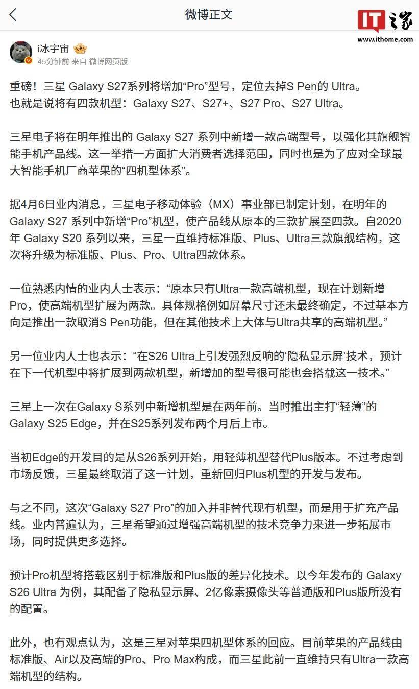i冰宇宙 发文透露,三星 Galaxy S27 系列将增加“Pro”型号,定位去掉 S Pen 的 Ultra。这意味着,Galaxy S27 系列将有四款机型,分别是 S27、S27+、S27 Pro 和 S27 Ultra。 据介绍,三星上一次在 Galaxy S 系列中新增机型是在两年前。当时推出主打“轻薄”的 Galaxy S25 Edge,并在 S25 系列发布两个月后上市。 当初 Edge 的开发目的是从 S26 系列开始,用轻薄机型替代 Plus 版本。不过考虑到市场反馈,三星最终取消了这一计划,重新回归 Plus 机型的开发与发布。与之不同,这次 Galaxy S27 Pro 的加入并非替代现有机型,而是用于扩充产品线。 据IT之家此前报道,消息称三星公司为了进一步压缩机身厚度,此前计划在屏幕中剔除数位板,实现超薄屏幕设计。不过,三星在重新评估后,目前已搁置了该超薄方案,并确认 Galaxy S27 Ultra 将继续保留对 S Pen 的全面支持。 ▲ IT之家图赏: 三星 Galaxy S26系列全系实拍