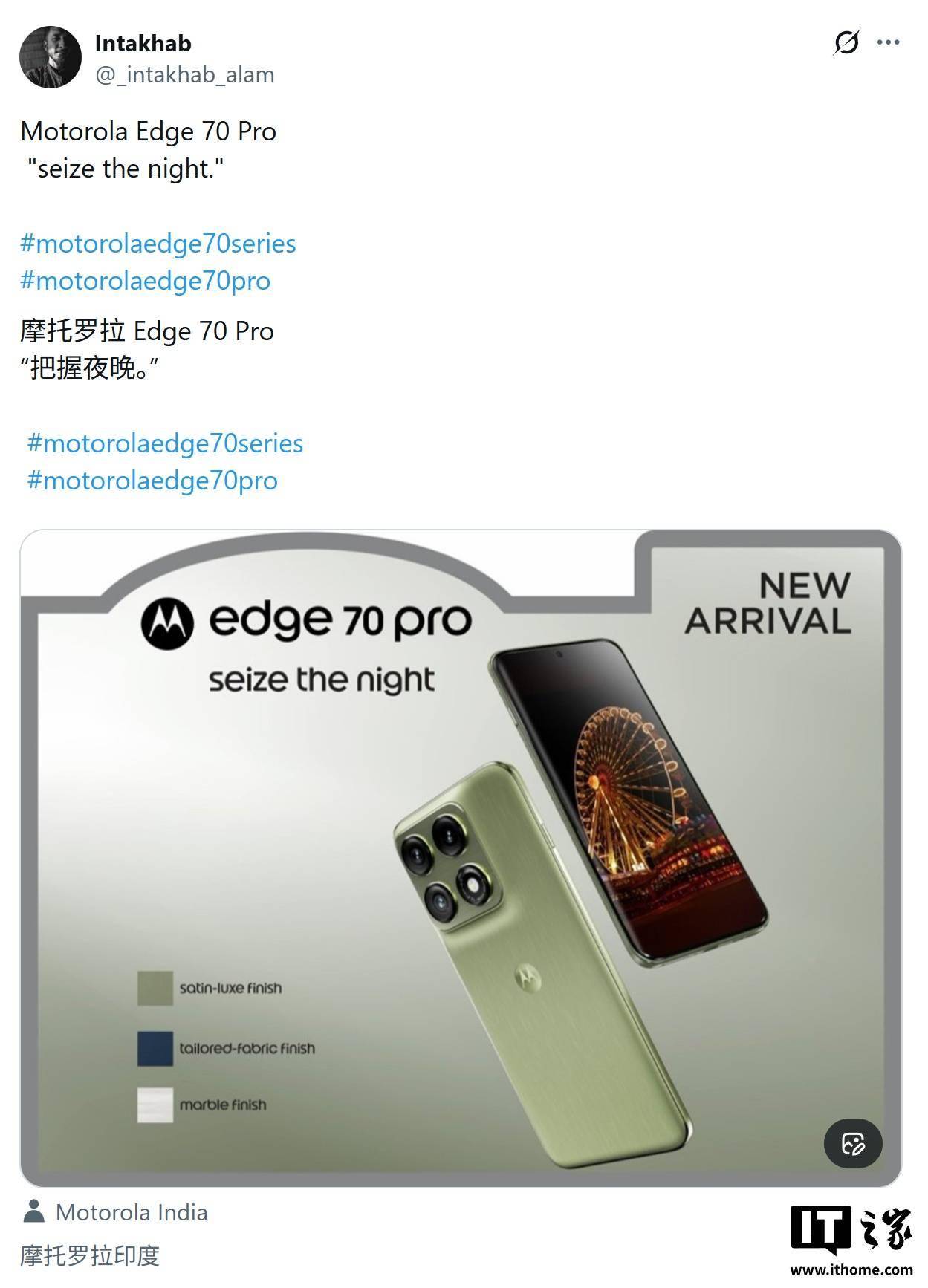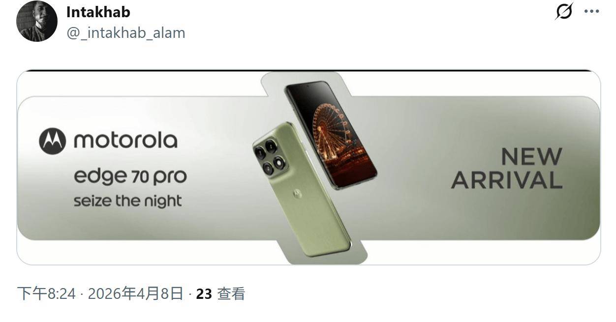 _intakhab_alam 今天(4 月 8 日)在 X 平台发布推文,分享了一组宣传物料,展示摩托罗拉 Edge 70 Pro 手机。 图片标语“Seize the Night”暗示该机将重点发力夜景拍摄,影像能力有望成核心卖点。IT之家附上相关截图如下: 外观方面,新机延续了摩托罗拉近年来的家族式语言。核心硬件参数方面,该机已通过相关认证,确认搭载 6500mAh 大容量电池,配合 90W 有线快充技术。