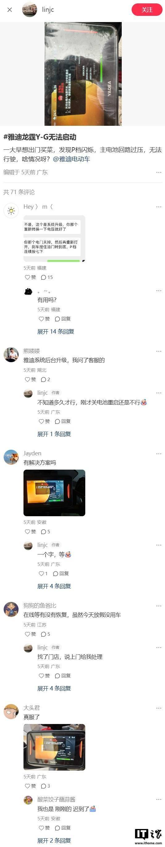 据新浪科技今日报道,全国多地车主表示,自己的雅迪电动车突然锁死在 P 档,无法启动。该故障主要涉及雅迪旗下的白鲨、龙霆两款高端车型。 近日,包括广东、湖北、海南、江苏、广西等全国多个省市的用户反馈,自己的雅迪电动车突然锁死在 P 档,无法启动。车辆仪表屏显示 H3 主电池回路过压,提示用户关闭坐桶内电源开关,3 分钟后重启;若未解决,请联系雅迪售后处理。 雅迪官方客服向该媒体证实,该问题主要因系统故障。目前官方已经推送固件去解决,受到影响的用户可以申请一年 GPS 流量作为补偿。 IT之家注意到,有网友给出了手动操作降电压的步骤,不过下方多人回复该方法没有用。还有网友表示可以找售后上门处理,2 分钟搞定。