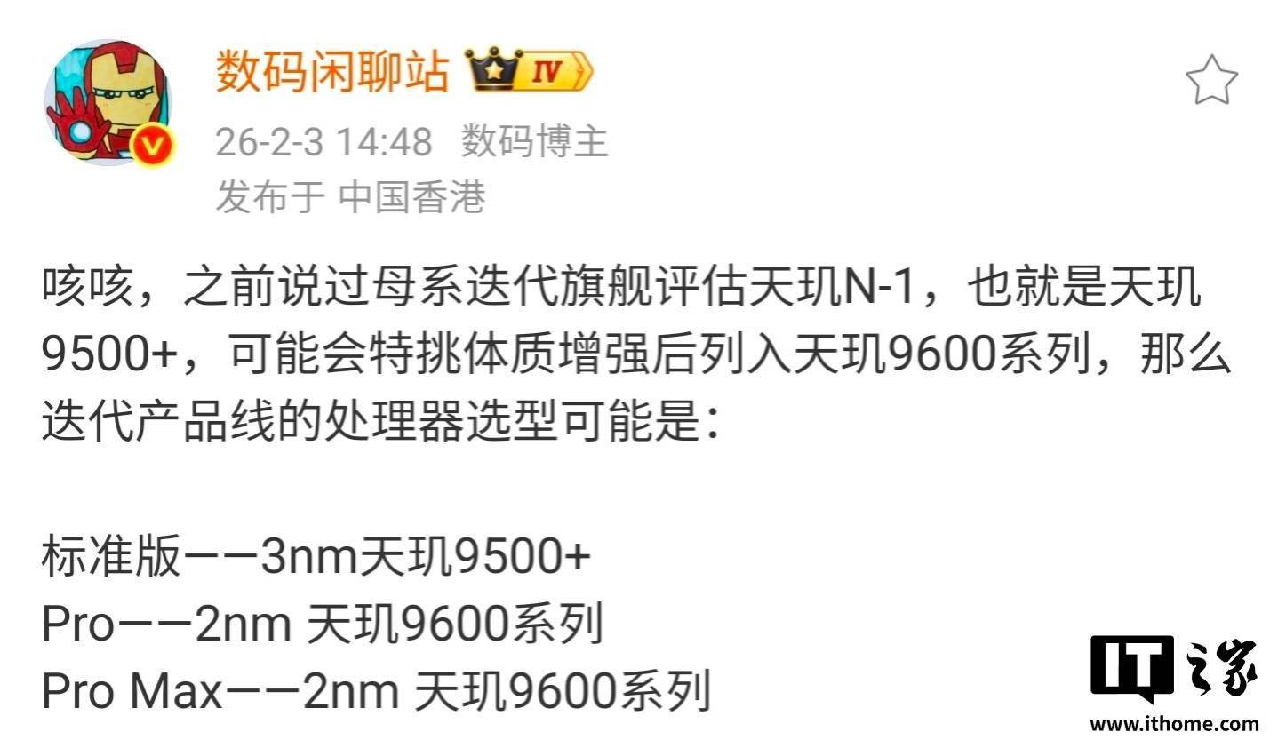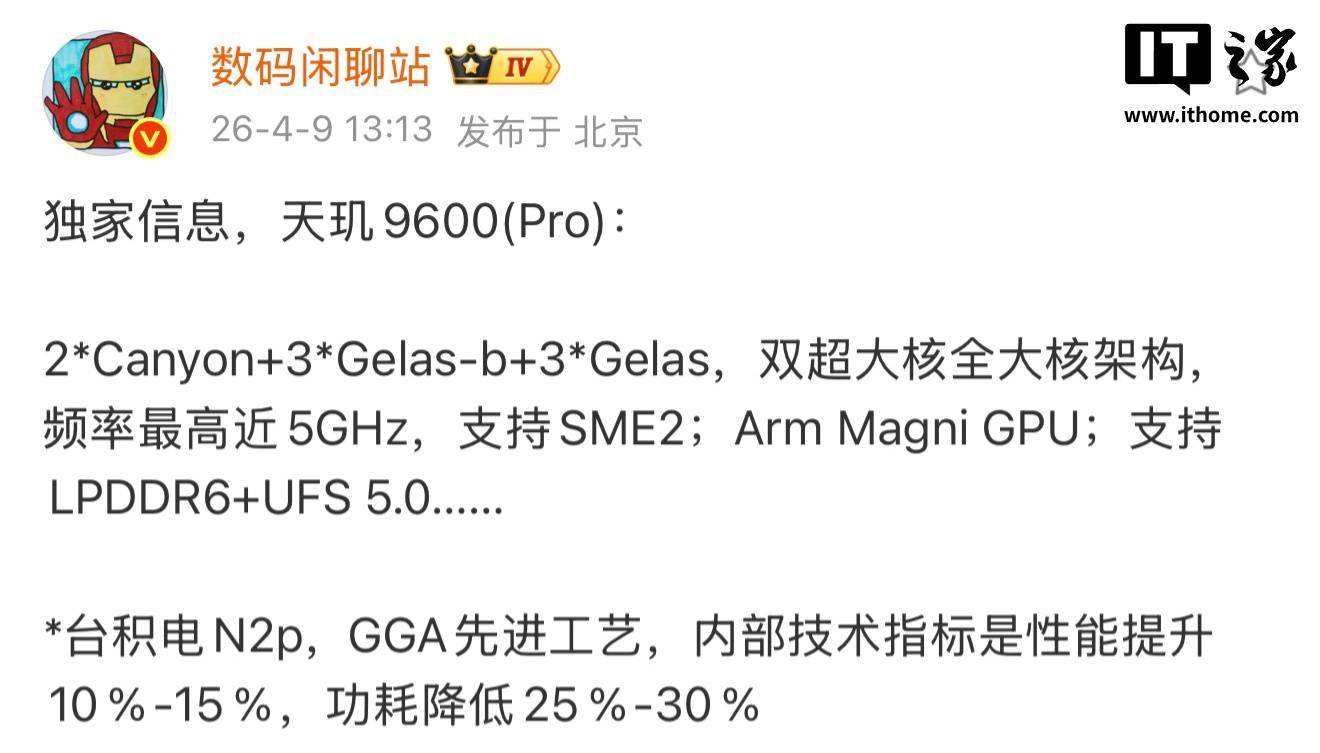 数码闲聊站 曝光天玑 9600(Pro)处理器部分规格。 据介绍,这款旗舰处理器采用 2*Canyon+3*Gelas-b+3*Gelas,双超大核全大核架构,频率最高近 5GHz,支持 SME2,配备 Arm Magni GPU,支持 LPDDR6+UFS 5.0 等。此外,其采用台积电 N2p,GGA 先进工艺,内部技术指标是性能提升 10%-15%,功耗降低 25%-30%。 IT之家注意到,该博主曾在今年 2 月表示,天玑 9500+ 处理器可能会特挑体质,增强后列入天玑 9600 系列,迭代产品线的处理器选型有望分成三杯: - 标准版 —— 3nm 天玑 9500+