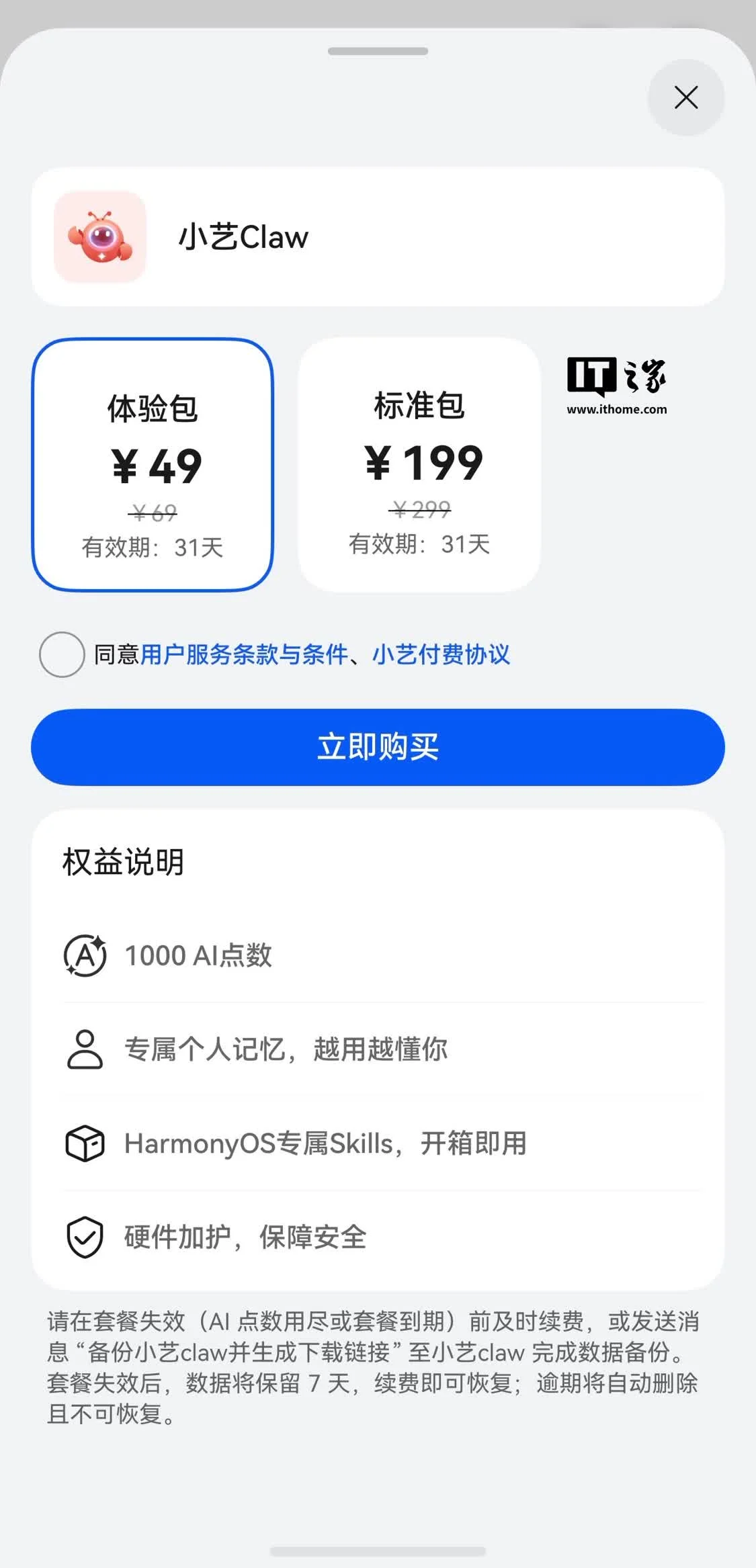 需要注意的是,鸿蒙手机“龙虾”小艺 Claw 需付费使用,体验包定价 69 元、首发价 49 元(有效期 31 天),提供 1000 AI 点数;标准包定价 299 元、首发价 199 元(有效期 31 天),提供 6000 AI 点数。