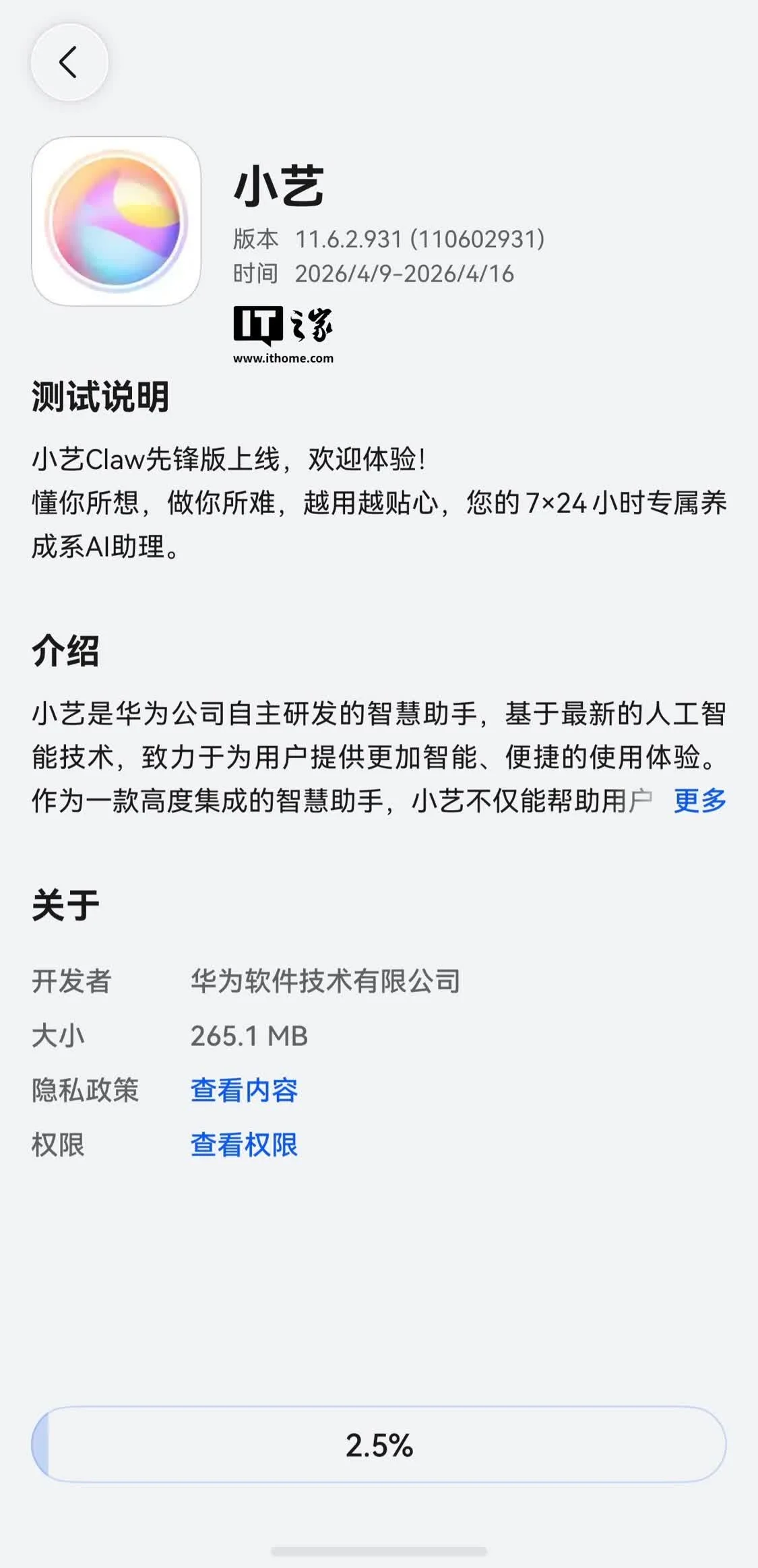 IT之家 4 月 9 日消息,华为小艺 App 今日开启 11.6.2.931 (110602931) 版本尝鲜升级,测试时间为 2026 年 4 月 9 日-2026 年 4 月 16 日。