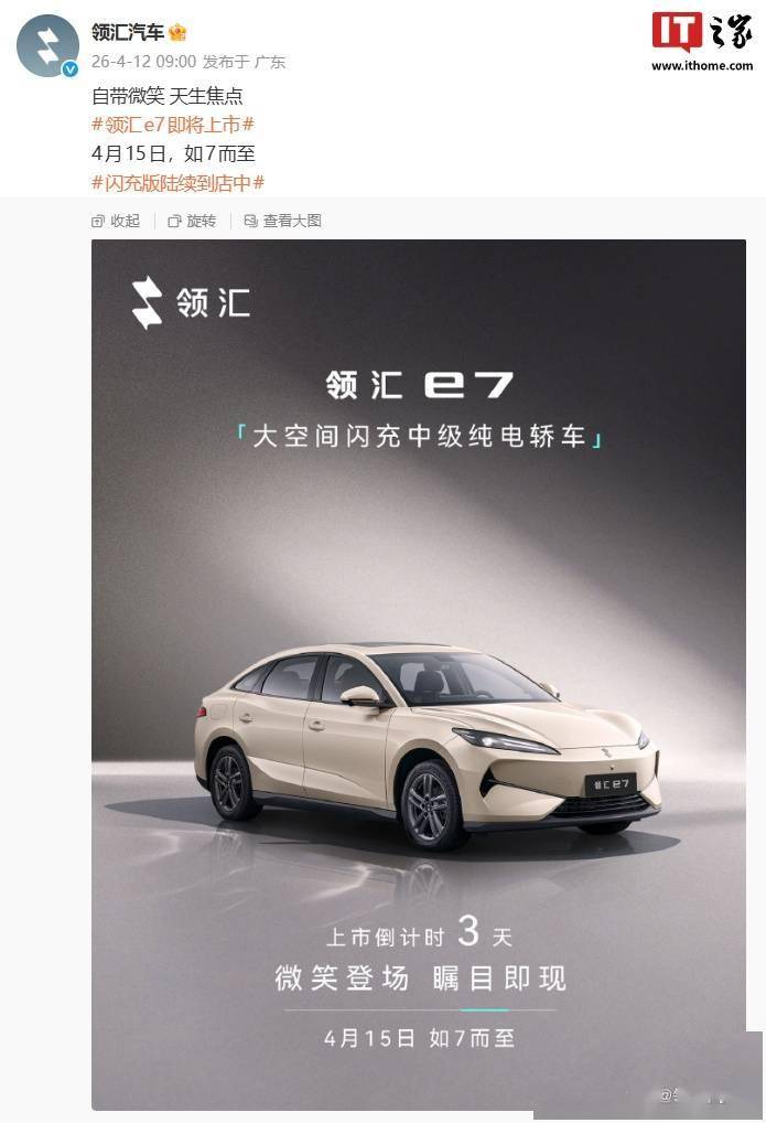比亚迪领汇汽车今日宣布,领汇 e7 将在 4 月 15 日上市。新车定位“大空间闪充中级纯电轿车”,目前闪充版陆续到店中。 IT之家注意到,比亚迪领汇汽车旗下首款车型领汇 e7 已于今年 2 月官宣,该车设计延续比亚迪海洋网家族风格。根据官方最新预热,领汇 e7 将搭载比亚迪闪充技术,可实现“5 分钟充好、9 分钟充饱”。 参考工信部申报信息,该车基本延续比亚迪 e7 整体造型,前后换装领汇新车标,车型充电口位置从右前翼子板区调整至车身右后侧。该车尺寸长宽高分别为 4780×1900×1515mm,轴距 2820mm。 动力方面,新车搭载前置单电机,分 100kW、130kW 版本;搭载弗迪磷酸铁锂刀片电池,电池循环寿命达 60 万公里,匹配营运周期;CLTC 续航有 450km、550km 等版本可选;采用宽温域热泵空调,冬季能耗更低。 IT之家注意到,根据官方此前预热海报来看,领汇汽车还将推出领汇 M9(MPV 车型)和领汇 e9(轿车)两款新车,上市时间待定。