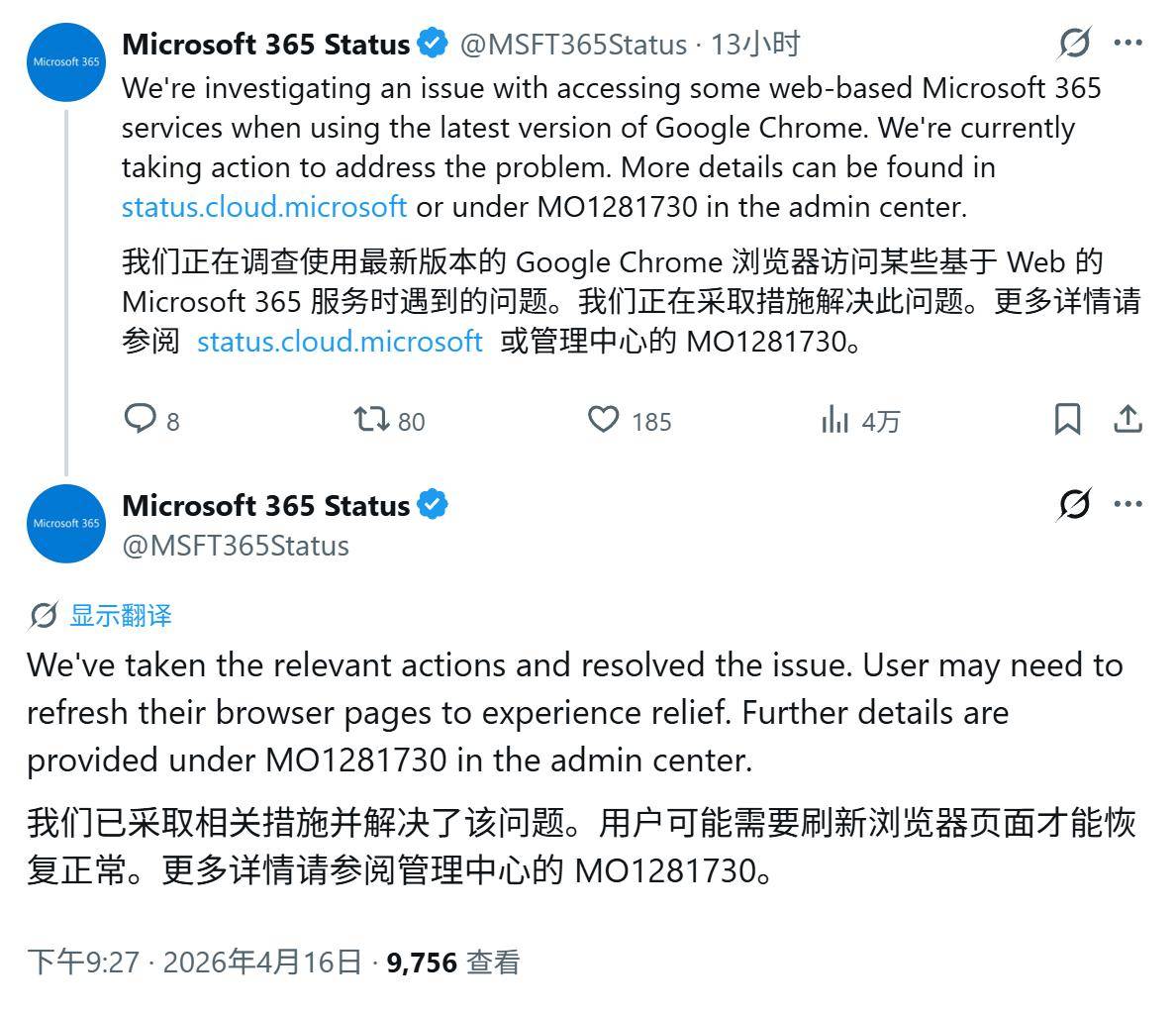 科技媒体 BornCity 今天(4 月 17 日)发布博文,微软在 17 个小时内,紧急修复 Chrome 147 浏览器无法正常使用 Microsoft 365 服务问题。 根据官方发布的紧急通知,微软确认部分 Chrome 147 浏览器用户无法访问 Microsoft 365 服务,问题涵盖 Microsoft 365 管理中心无法正常加载界面元素、无法通过网页打开 Excel 或 PowerPoint 文件,以及 OneDrive 和 Planner 等应用访问异常。 网友反馈在 Chrome 147.0.7727.102 版本中,访问 purview.microsoft.com和 security.microsoft.com网址显示空白页面,但同一设备上的 Firefox 和 Edge 浏览器均可正常访问。 IT之家附上相关截图如下: 微软在事件编号 MO1281730 中披露初步根因:Google Chrome 针对 DigiCert Global Root CA(G1)实施广泛的证书信任变更,不再信任特定认证配置。 微软此前已将大部分 Microsoft 365 服务迁移至备用认证配置,但少数服务未完成过渡,导致 Chrome 更新后认证配置被拒绝,进而引发访问故障。 此次故障始于世界协调时间 4 月 15 日 19:00(北京时间 16 日凌晨 3 点),持续约 17 小时,于 4 月 16 日 11:56(北京时间 16 日 19:56)完成修复。 微软表示已采取缓解措施,遥测数据显示问题已解决,用户刷新浏览器页面即可生效。桌面客户端全程未受影响,用户可通过本地应用继续使用相关服务。 相比之下,Microsoft Edge 和 Firefox 因采用不同的证书信任机制,在此次变更中未受波及。