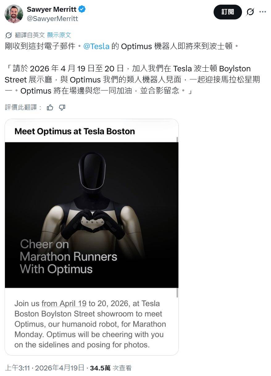 据科技媒体 Teslarati 今天报道,特斯拉人形机器人 Optimus 今天出现在美国波士顿马拉松,但它并没有上赛场跑步,而是在冲刺路段旁为参赛跑者加油助威,并与观众合影留念。 据报道,目前 Optimus 机器人正在博伊尔斯顿(Boylston)街 888 号的特斯拉展厅,而波士顿马拉松最后一英里的路线正好沿着博伊尔斯顿街一路延伸,选手们都会经过大型商店,最终抵达位于科普利广场(IT之家注:Copley Square)的终点。 作为参考,Optimus 最早亮相于 2021 年的特斯拉 AI Day,当时马斯克认为,人形机器人可以替人类承担危险、重复且不受欢迎的工作。 同时马斯克表示,Optimus 从长远来看可能比汽车业务更重要,并且公司未来 80% 的利润将来自机器人项目。不过这些“大饼”能否实现还得看具体量产时间。