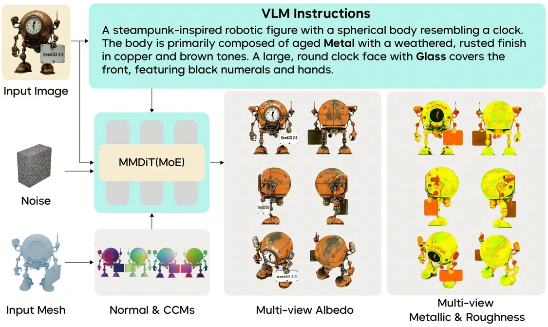 ▲ Seed3D 2.0 几何生成的完整流程 同时,Seed3D 2.0 采用统一的 PBR 生成模型联合建模完整 PBR 贴图,使用 MoE 架构提升高分辨率材质细节与边界精度,并且引入 VLM 先验,增强未知光照下的材质分解稳定性与准确性。