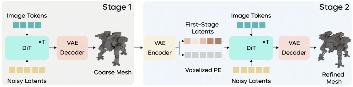 Seed3D 2.0 引入 Coarse-to-Fine 两阶段生成策略,把“整体结构”和“几何细节”解耦,分开优化,从而在锐利边缘、薄壁结构和复杂拓扑等几何生成难点上取得突破。