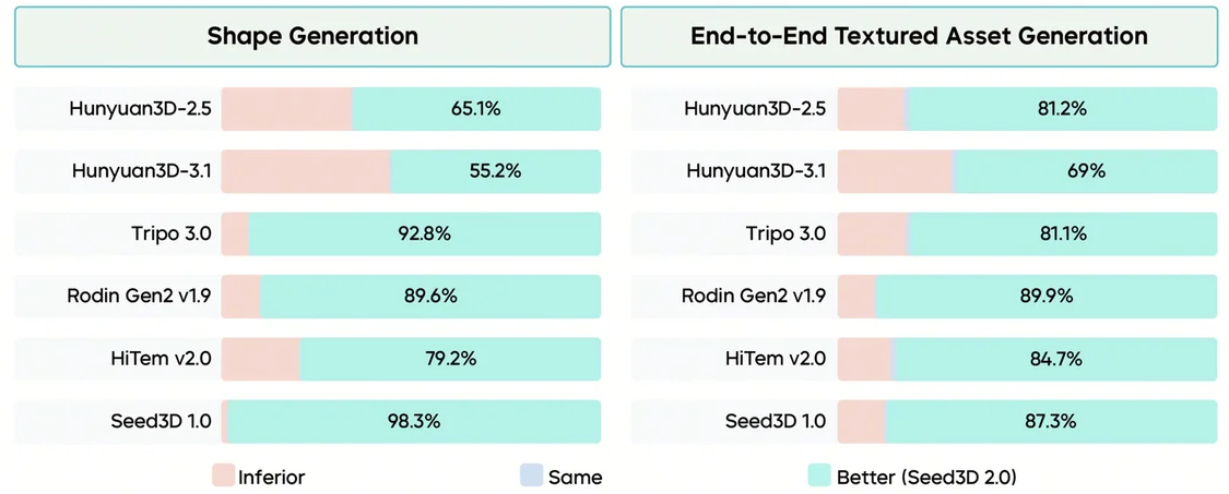 ▲ 几何生成维度的定性对比 字节跳动招募了 60 位具有 3D 建模经验的人类打分员,对 Seed3D 2.0 和六个主流模型的生成质量进行两两盲评对比。