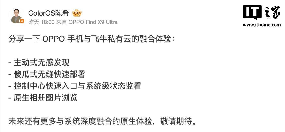 飞牛 fnOS 官方于 4 月 20 日宣布与 OPPO 达成深度生态合作。OPPO ColorOS 设计总监陈希昨天(4 月 22 日)分享了 OPPO 手机与飞牛私有云的融合体验。 IT之家注:飞牛 fnOS 是一款基于 Linux 内核(Debian 发行版)深度开发的国产 NAS 系统,兼容主流 x86 硬件设备,并于今年 2 月发布 ARM 架构的公测版。系统功能涵盖影音管理、相册智能备份、Docker 服务部署及远程访问等功能。 据介绍,OPPO 手机可以主动式无感发现飞牛私有云,支持傻瓜式无缝快速部署。 在 OPPO 手机上还集成了控制中心快速入口与系统级状态监看,支持原生相册图片浏览。陈希称未来还有更多与系统深度融合的原生体验。
