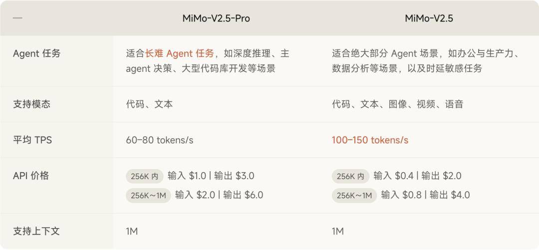- MiMo-V2.5 具备更高的平均推理速度,可以更迅速地响应对时延敏感的任务