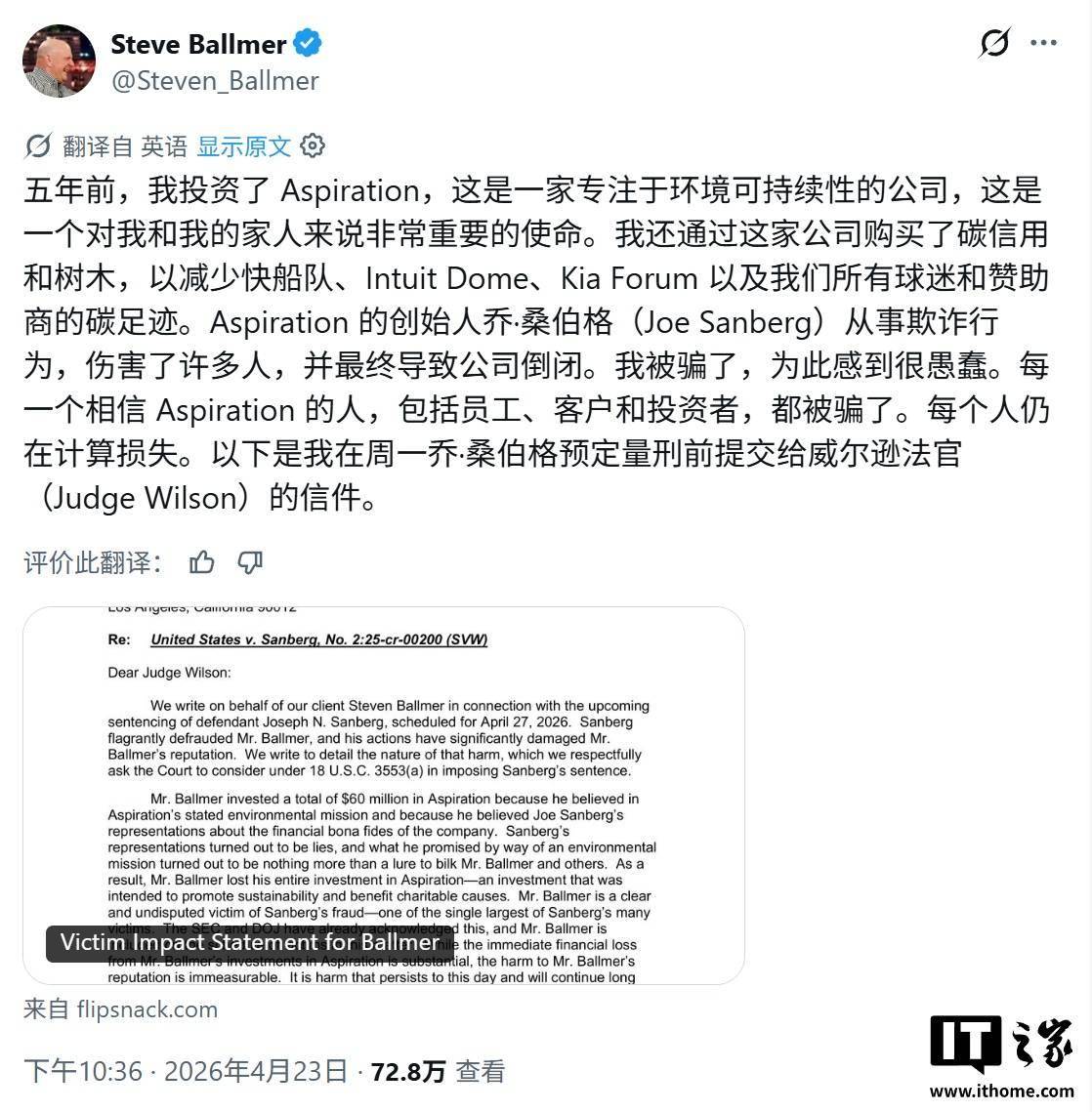 科技媒体 TechCrunch 昨日(4 月 24 日)发布博文,报道称微软前任首席执行官史蒂夫 · 鲍尔默(Steve Ballmer)公开抨击 Aspiration 联合创始人约瑟夫 · 桑伯格(Joseph Sanberg),并表示被欺骗投资 6000 万美元(IT之家注:现汇率约合 4.11 亿元人民币)。 根据美国司法部公示的案件通报,美国司法部指控他伪造财务记录,欺骗投资者和贷款方,每项罪名最高可判处 20 年监禁。桑伯格于 2025 年 8 月对两项电信欺诈罪名认罪。 作为科技界巨擘与 NBA 快船队老板,史蒂夫 · 鲍尔默不仅是 Aspiration 的投资人,还与其签订了碳抵消合作协议。 在宣判前提交给法官的信中,鲍尔默详细陈述了自己的受害经历。他透露自己共投入 6000 万美元,如今已全部亏损。他在公开信中坦言自己“被欺骗了,并为此感到愚蠢”,强调所有相信该公司的人均遭受了损失。 欺诈细节显示,桑伯格向投资者展示了一份伪造的审计委员会信函,谎称公司拥有 2.5 亿美元现金及等价物,而实际金额不足 100 万美元。他甚至将自有实体产生的营收计入公司账目,伪造稳定的客户流与营收假象。这些虚假陈述帮助其获取了 1.45 亿美元贷款,而公司原本计划的 23 亿美元 SPAC 上市交易最终告吹。 图源:WikiMedia