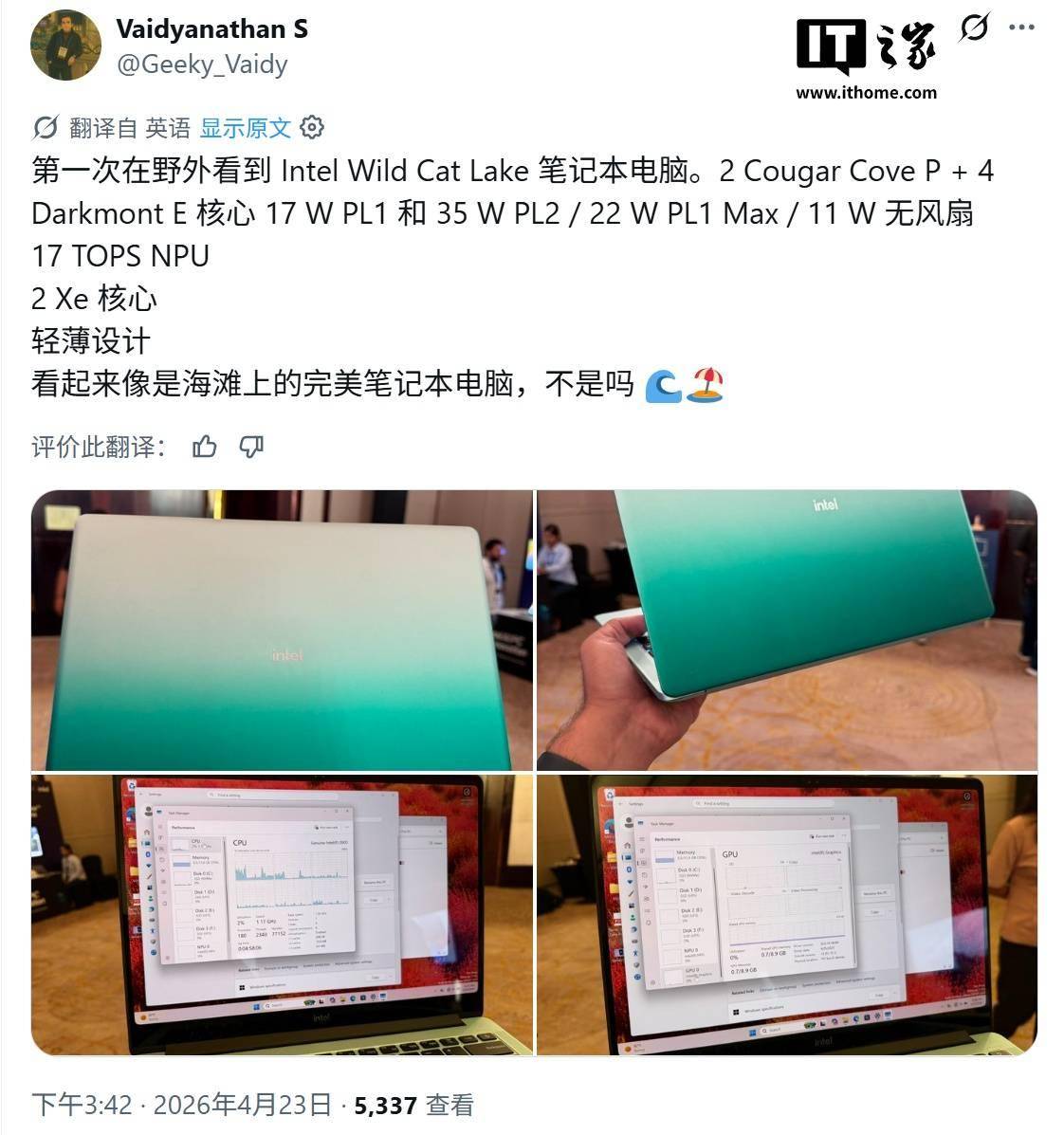 科技媒体 NoteBook Check 于 4 月 23 日发布博文,近距离体验了搭载英特尔 Wildcat Lake 处理器的参考设计笔记本,主要面向无需高性能计算的轻薄本市场。 这款参考设计笔记本采用铝合金机身,配备 14 英寸屏幕,采用充满活力的绿色配色,该媒体认为上市后将会和苹果 MacBook Neo 直接竞争。 处理器采用 6 核架构,包含 2 个 Cougar Cove P-cores(性能核)和 4 个 Darkmont LPE-cores(低功耗能效核)。 功耗设定方面,PL1 为 17 瓦,最大功耗 22 瓦,PL2 为 35 瓦。英特尔工作人员介绍强调,在无风扇系统中 TDP 可限制至 11 瓦,即便没有主动散热也能正常运行。 其他配置包括算力达 17 TOPS 的 NPU(神经网络处理单元)和双核核显。设备配备 16 GB 板载内存,推测速率可能为 7467 MT/s。IT之家附上相关图片如下: