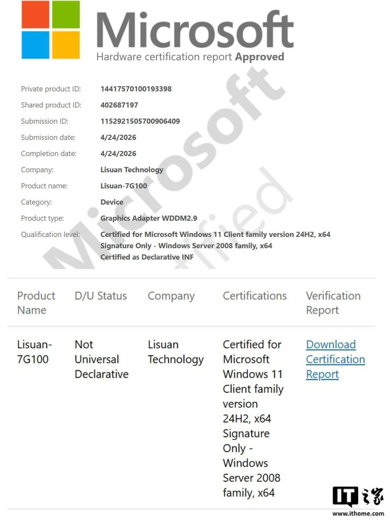 IT之家 4 月 26 日消息,据微软官网数据,砺算科技 7G100 现已通过微软 WHQL 认证。砺算科技成为国内首家、全球第四家通过此认证的 GPU 公司(另外三家是英伟达、AMD 和英特尔)。 IT之家注:WHQL(Windows 硬件质量实验室测试)是微软设立的硬件兼容认证体系。它通过严格的测试流程,验证硬件设备及驱动程序与 Windows 操作系统的稳定性和兼容性。旨在确保硬件 / 驱动能在 Windows 系统中稳定运行。 作为参考,砺算科技 7G100 系列 GPU 采用 TrueGPU 架构,基于 6nm 制程工艺打造,从计算核心、指令集到整体架构均由砺算独立完成自主研发,不依赖任何外部技术授权,显著增强应对外部技术限制风险的能力。【】 在今年 3 月的 AWE 2026 砺算科技产品发售会中,砺算科技 LX 7G106 消费卡正式亮相,配备 12GB GDDR6 显存,兼容 OpenGL、Vulkan、WHQL、Unity 等主流 API 和图形引擎,可顺畅运行《赛博朋克 2077》《黑神话:悟空》《生化危机 4:重制版》等 Steam 游戏,同时支持多款主流 AI PC 大模型。