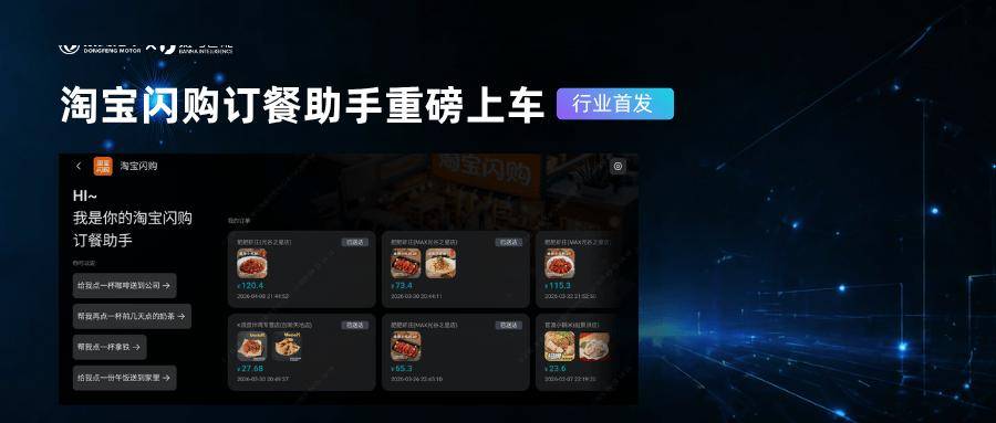 IT之家 4 月 26 日消息,今日,2026 北京国际车展期间,斑马智能与东风研发总院联合宣布,基于元神 AI 打造的淘宝闪购 Agent 首发上车,将落地东风天元智舱。 据官方介绍,在天元智舱中,用户无需动手、无需跳转,仅通过自然语音即可完成点餐全流程。当用户说“给我点杯奶茶送到公司”,淘宝闪购 Agent 能精准识别模糊意图,自动匹配附近门店、推荐餐品规格,并支持中途修改、随心更换,真正实现“一句话点餐闭环”。 - 真全品类美食:从奶茶咖啡到正餐夜宵,手机上能点的美食,车里一站式全覆盖;