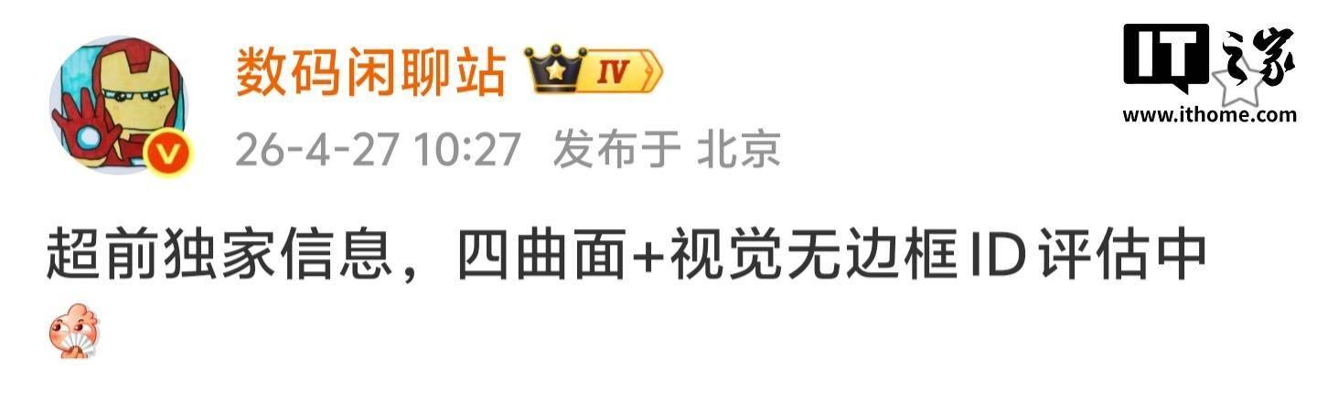 数码闲聊站 今日发布超前独家信息:四曲面 + 视觉无边框 ID 评估中。结合该博主此前的爆料习惯,预计这款新机为 OPPO 旗下。 IT之家注意到,今年有多家厂商有望推出四曲面新机。 博主 数码闲聊站 曾在 4 月 24 日发文,透露供应链反馈苹果正找三星定制“曲率不大的四微曲面板”,相应消息指向了传闻已久的“苹果 20 周年版 iPhone”。同时该博主还透露今年下半年“国产 TOP5”将推出等深四曲面新机。 关于各家新机的具体形态以及发布时间,感兴趣的朋友可以关注IT之家后续报道。