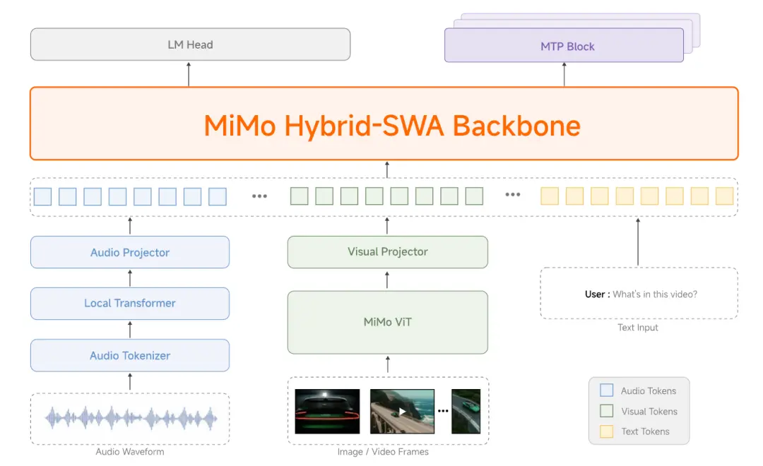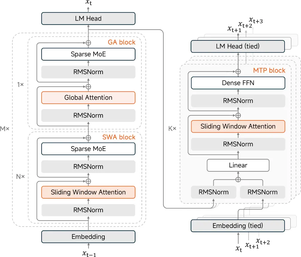 ▲MiMo-V2.5-Pro的最新测评成绩 开源首日,MiMo-V2.5-Pro宣布已完成与阿里平头哥、亚马逊云科技、AMD、百度昆仑芯、燧原科技、沐曦、天数智芯多个芯片厂商的接入适配。MiMo-V2.5系列模型同步完成SGLang和vLLM主流推理框架的Day 0适配。 与此同时,小米还推出百万亿Token创造者激励计划,计划30天内免费发放总计100万亿Token权益;推出Agent生态共建计划,目前已与OpenCode、Hermes Agent、KiloCode等Agent框架厂商展开合作。 模型权重合集: https://huggingface.co/collections/XiaomiMiMo/mimo-v25 更多细节参考模型Blog: https://mimo.xiaomi.com/index#blog 百万亿Token计划申请网址: https://100t.xiaomimimo.com/ 01. 模型技术细节公布 测评超越DeepSeek-V4 由小米最新公开的模型卡可知,小米迄今为止最强模型MiMo-V2.5-Pro是一款拥有1.02万亿(1.02T)个参数的混合专家模型,其中420亿(42B)个激活参数,基于混合注意力架构,相比前代模型在通用智能能力、复杂软件工程和长时域任务处理方面均实现了显著提升。 MiMo-V2.5-Pro继承了MiMo-V2-Flash的混合注意力机制和多标记预测(MTP)设计。局部滑动窗口注意力(SWA)和全局注意力(GA)以6:1的比例交错使用,窗口大小为128个Token,在长上下文情况下,通过可学习的注意力池偏置,将键值缓存存储空间减少了近7倍,同时保持了性能。一个轻量级的MTP模块,采用密集前馈神经网络(FFN),原生集成用于训练和推理,输出吞吐量大约提升了三倍,并加速了强化学习(RL)的部署。