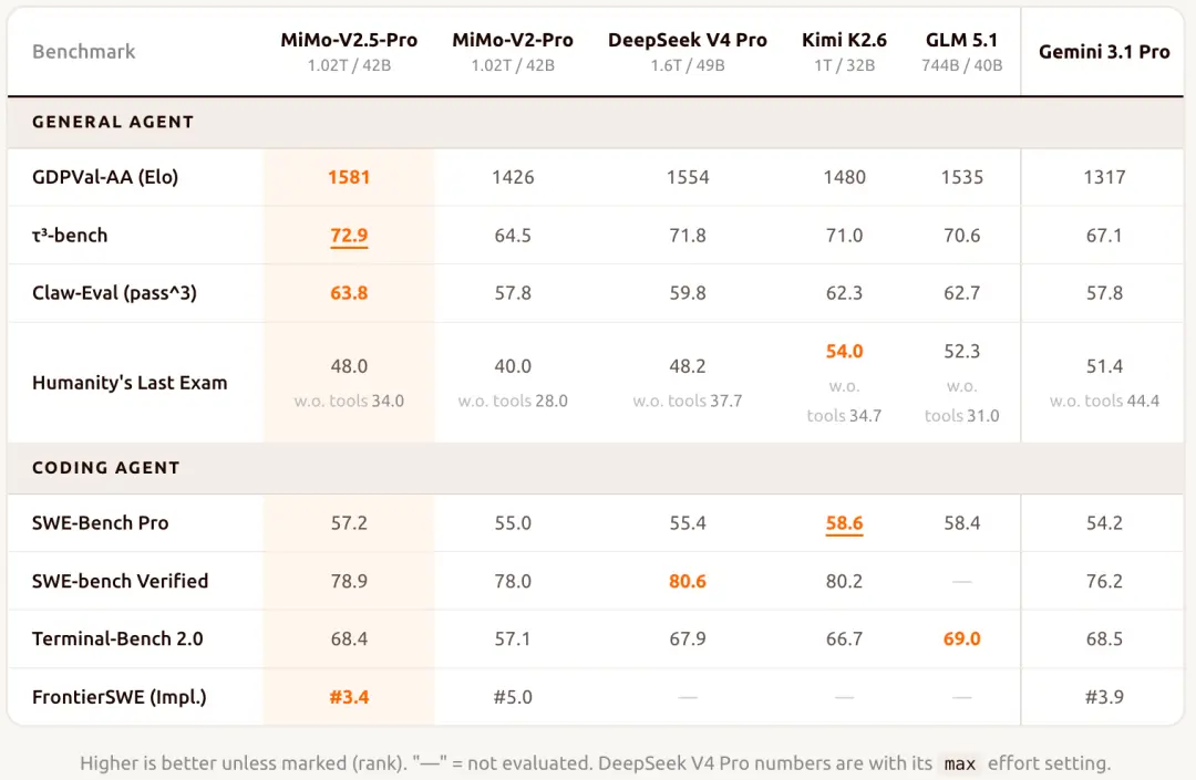 ▲MiMo-V2.5-Pro在Hugging Face的开源页面截图 此前,该系列模型于4月23日开启公测,包括MiMo-V2.5-Pro、MiMo-V2.5两款模型。模型具备更强Agent能力,支持100万上下文,且Token效率大幅提升。 MiMo-V2.5-Pro的完整基准测试结果今日公布,小米称其在GDPVal-AA(Elo)、Claw-Eval(pass^3)等多项测评中超过了最新开源的DeepSeek-V4-Pro模型,也超过了发布不久的Kimi K2.6等主流闭源模型,实现总体最佳。
