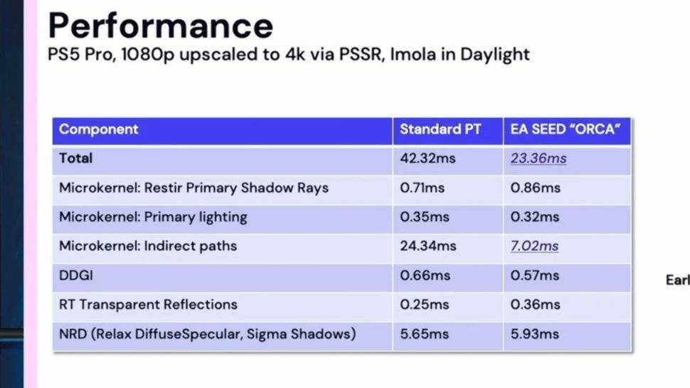 数毛社(digitalfoundry)昨日(4 月 27 日)发布博文,报道称在 GDC 2026 演讲中,Codemasters 开发团队在索尼 PlayStation 5 Pro 游戏主机上,演示为《F1 25》游戏初步启用路径追踪(Path Tracing)。 路径追踪是一种高级光线追踪渲染技术,通过追踪光线在场景中的多次反弹路径来计算光照效果。相比传统光栅化渲染,它能呈现更真实的反射、折射和全局光照,但计算成本极高,通常需要高端显卡支持。 项目源于 PC 版本开发经验,团队测试 AMD RX 9070 XT 显卡时,发现游戏能在 4K 分辨率下提供稳定 30 帧表现,激发了团队其它硬件上尝试路径追踪的想法。 在 PS5 Pro 上演示版本采用 1080p 内部分辨率,通过 PSSR 技术提升画质至 4K 输出。早期移植版本帧时间约为 42.32 毫秒,仅相当于 24 FPS;而采用 EA Seed 研究部门的 ORCA 原型后,帧时间缩短至 23.36 毫秒,达到约 43 FPS。 测试环境选在需求较低的伊莫拉日间赛道,夜间或雨天场景因动态光源增多,计算成本会显著增加。技术层面,该原型摒弃了多数路径追踪游戏使用的复杂辐射缓存,改用 DDGI(动态漫反射全局光照技术)处理二次光线反弹。 IT之家注:动态漫反射全局光照技术用于实时计算场景中的间接光照。相比传统的辐射缓存方案,DDGI 能提供更稳定的光照结构,计算效率更高,特别适合 F1 这类高速运动场景,避免了光照闪烁和性能波动问题。