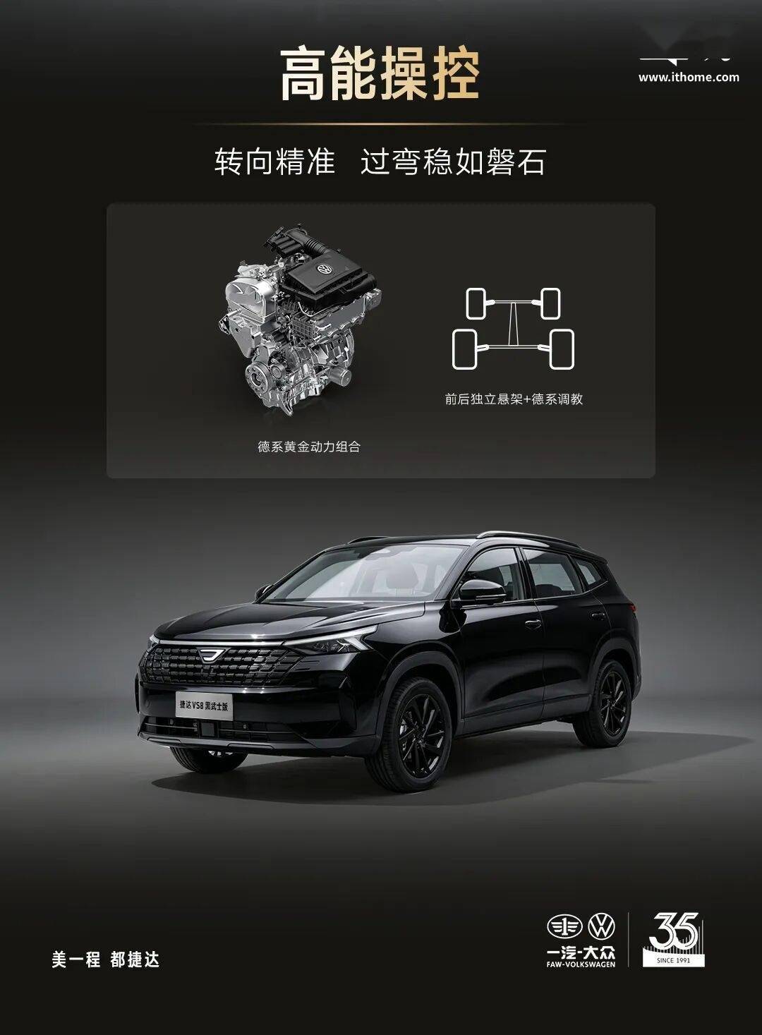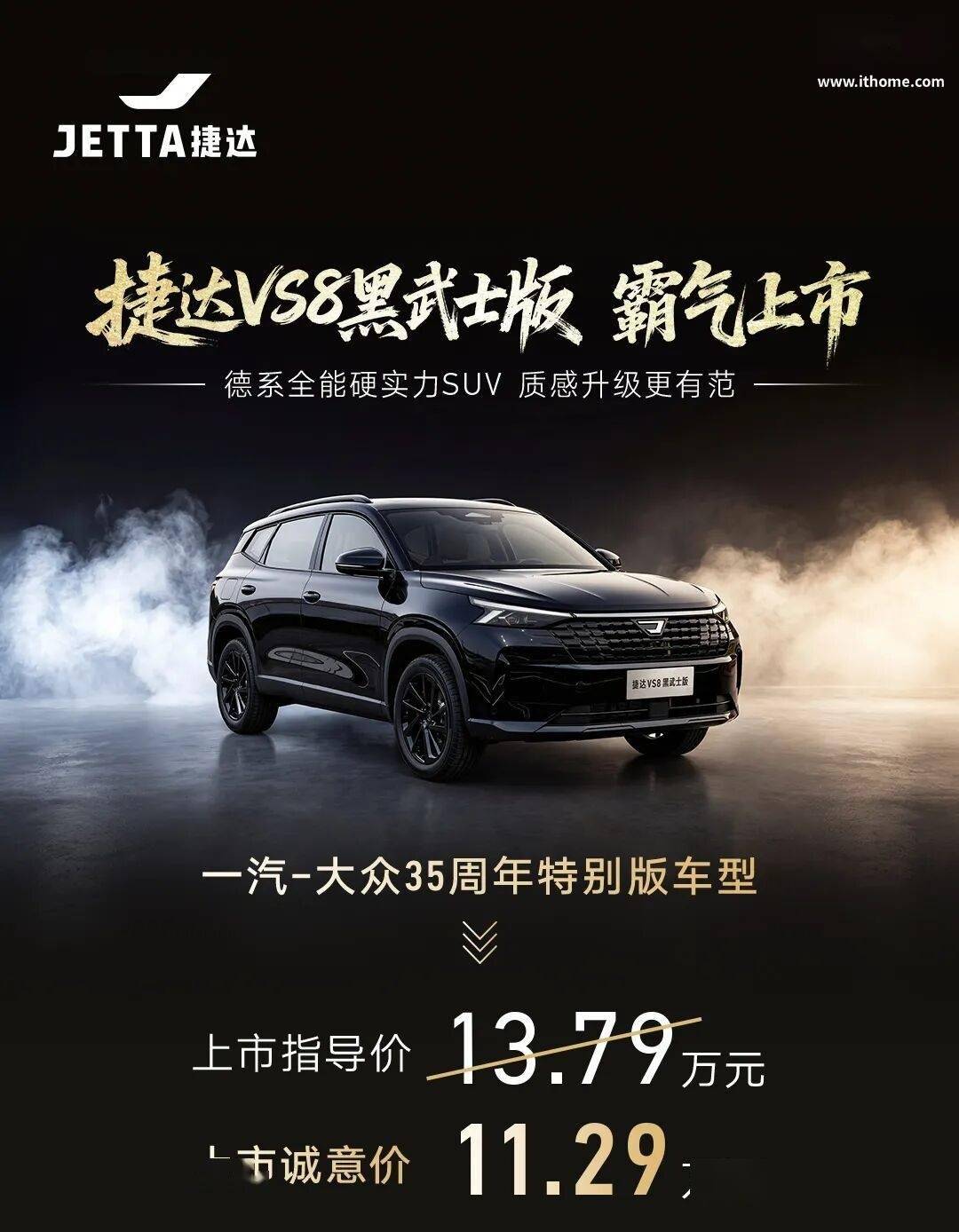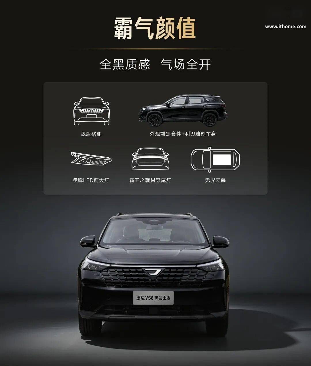 IT之家 4 月 28 日消息,捷达 VS8 黑武士版汽车今日正式上市,上市指导价 13.79 万元,上市诚意价 11.29 万元。 该车可享至高 8000 元厂家置换补贴、限时免费加装座椅通风、限时 1 元享终身质保。 捷达 VS8 黑武士版采用了全黑设计,搭载外观熏黑套件 + 利刃雕刻车身,配有凌眸 LED 前大灯、霸王之戟贯穿尾灯、无界天幕。 捷达 VS8 汽车原版于 2025 年 9 月上市,指导价 11.99 万元起,上市诚意价 9.59 万元起。 IT之家查询捷达官网获悉,捷达 VS8 黑武士版是该车的新增顶配车型,尺寸为 4629×1851×1624mm,轴距 2731mm,配有 18 英寸双色铝合金轮毂(熏黑)、车顶行李架(熏黑)、高亮黑“JETTA”字母尾标及字标。 该版本还独享 50W 手机无线充电、数字钥匙 & 手机远程控车。 动力配置方面,捷达 VS8 黑武士版与原版相同,搭载大众 EA211 直列四缸涡轮增压 1.4T 发动机,最大功率为 110 千瓦,传动系统匹配 6 挡手自一体变速箱。