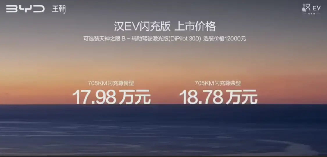 凤凰网科技讯 4月28日,比亚迪今日正式发布汉 EV 闪充版车型,官方指导价 17.98 万元起,用户可加1.2万元选装天神之眼B辅助驾驶激光版。该车被官方称为全球最低能耗的C级轿车,核心升级集中在电池与充电技术领域。