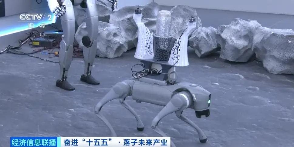 总台央视记者 宁坤:这个场景模拟的是未来我们在月球表面建设基地时,不同类型的智能机器人利用6G网络去进行自主协同作业的现场。模拟的是管道出现破损的情况,很快四足机器狗就运输着相应的物料到了现场,交给旁边的双足机器人进行维修作业。显示的整体网络上行速率已经超过了每秒100兆。即使单个机器人所使用到的上行传输速率,也要比目前5G网络环境下单个用户使用的上行传输速率高出5到10倍左右。