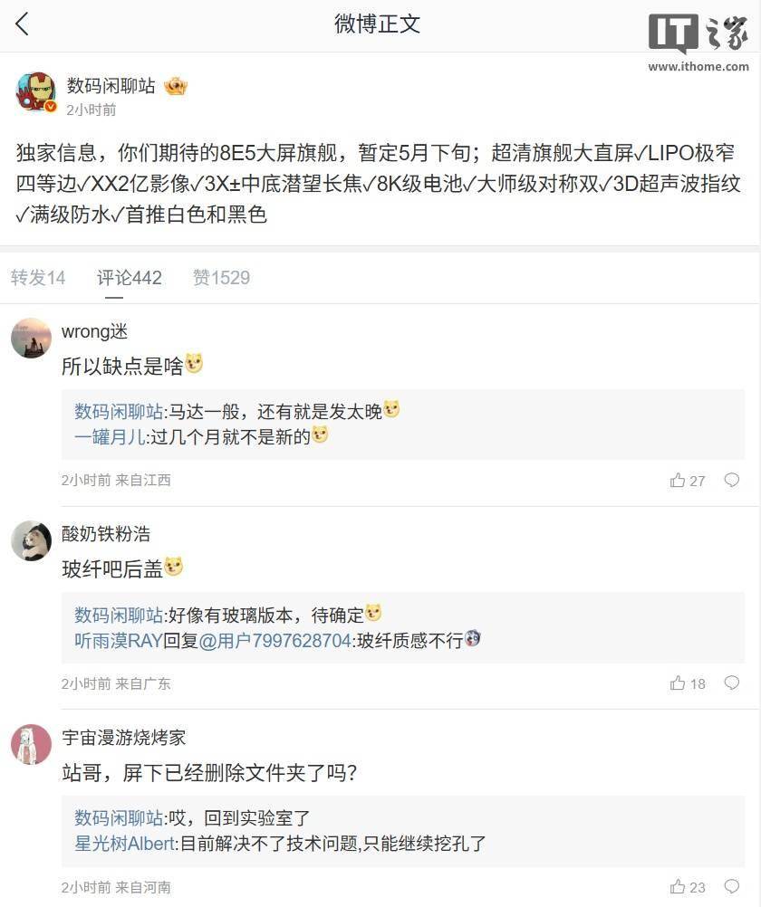 数码闲聊站 今日爆料了一款 8E5 大屏旗舰手机: 独家信息,你们期待的 8E5 大屏旗舰,暂定 5 月下旬;超清旗舰大直屏✓LIPO 极窄四等边✓XX2 亿影像✓3X± 中底潜望长焦✓8K 级电池✓大师级对称双✓3D 超声波指纹✓满级防水✓首推白色和黑色