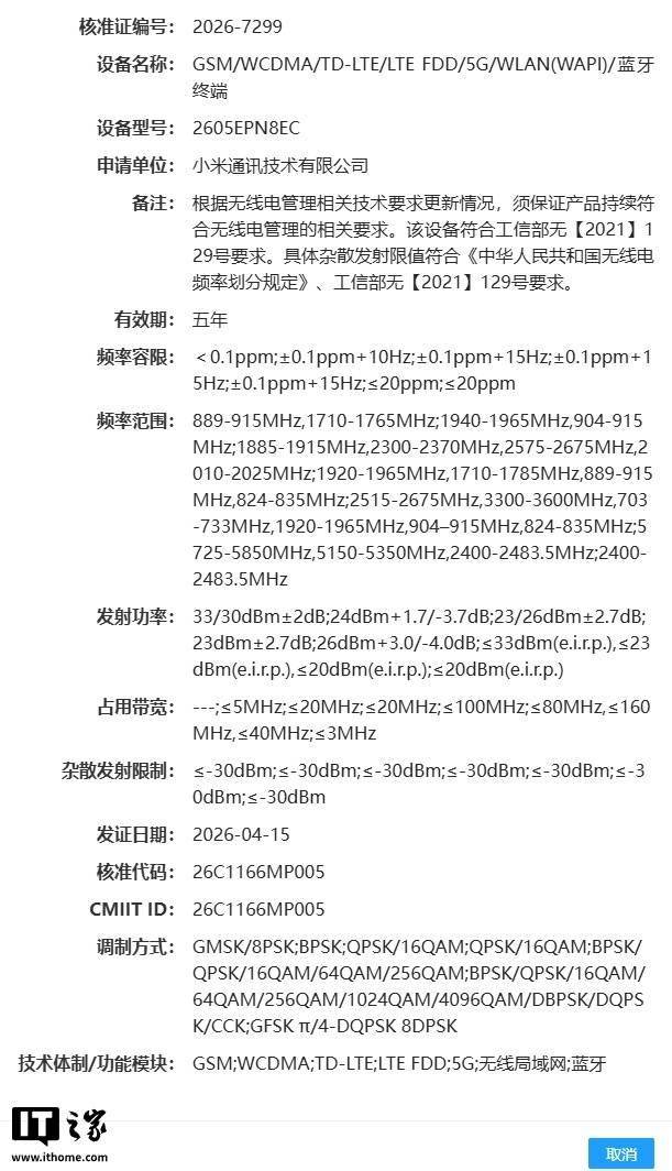 从博主暗示和评论区猜测来看,预计这款 8E5 大屏旗舰手机是小米 17Max。 该博主表示,这款手机马达一般,好像有玻璃后盖版本。博主还称屏下摄像头“回到实验室了”。 有一款型号为 2605EPN8EC 的小米新机于 4 月 15 日通过了工信部 SRRC 认证,结合此前爆料来看即为 17 系列大屏新机,预计将命名为小米 17 Max(也有人称小米 17S Pro)。 从型号来看,小米内部规划于今年 5 月发布,目前已有爆料指向 6.9 英寸 1.5K 四等窄直屏、200Mp 主摄 +50Mp 长焦微距 + 对称双扬,预计搭载第五代骁龙 8 至尊版,不排除提供玄戒版本的可能。 该机与此前的小米 17 Pro Max有很大不同,取消了比较出圈的背屏设计,用节省下来的空间堆更大的电池容量,此前曝光的电池为额定 7850mAh / 典型值 8000mAh±,这也是小米品牌手机最大容量电池。